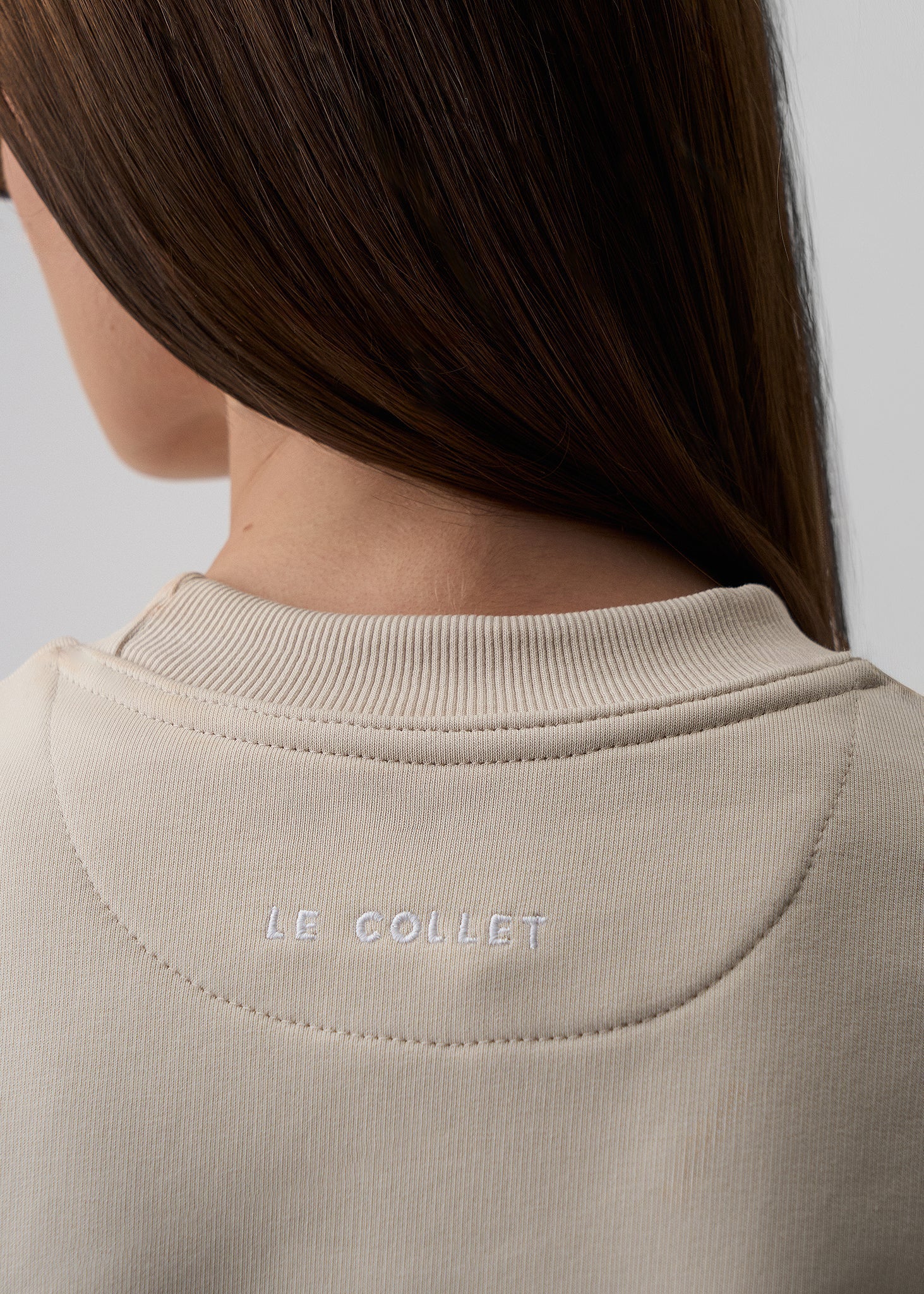 Bluza bez kaptura w kolorze beżowym. Posiada prosty fason z okrągłym dekoltem, prostymi rękawami i ściągaczami na mankietach oraz w talii. Element ozdobny stanowi haft z logo umieszczony na wysokości karku.