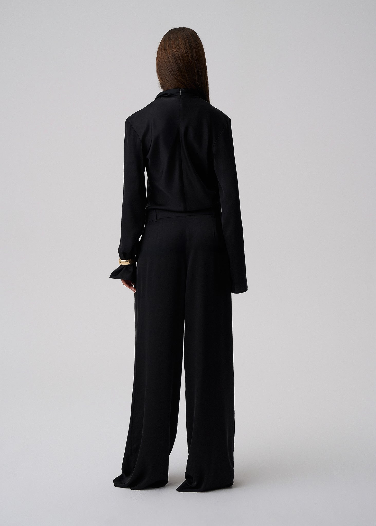 Elegancka bluzka o satynowym wykończeniu, które subtelnie odbija światło i nadaje stylizacji wyrafinowanego charakteru. Luźny krój z miękko układającą się tkaniną i dekoracyjną, opadającą szarfą przy dekolcie.