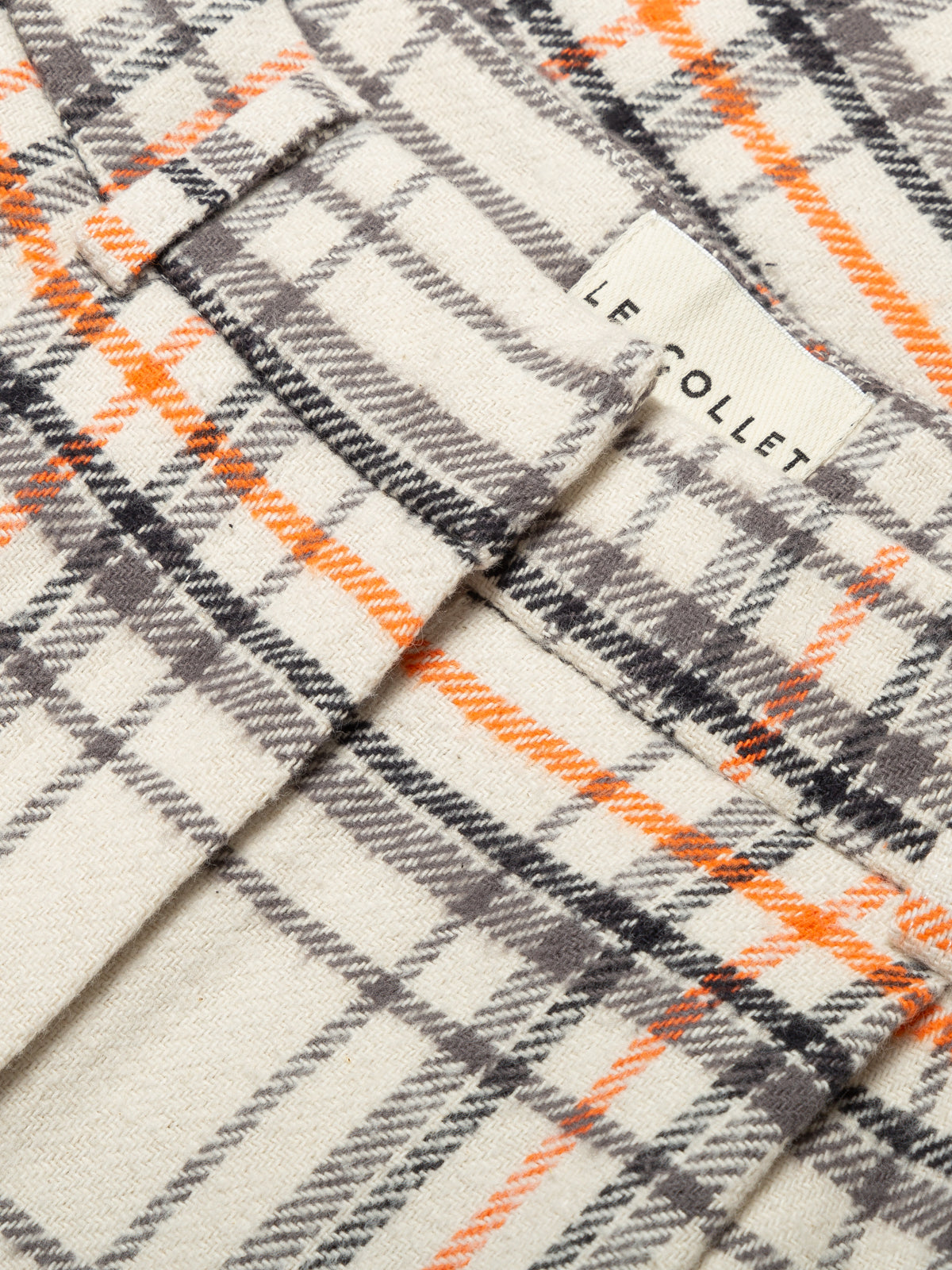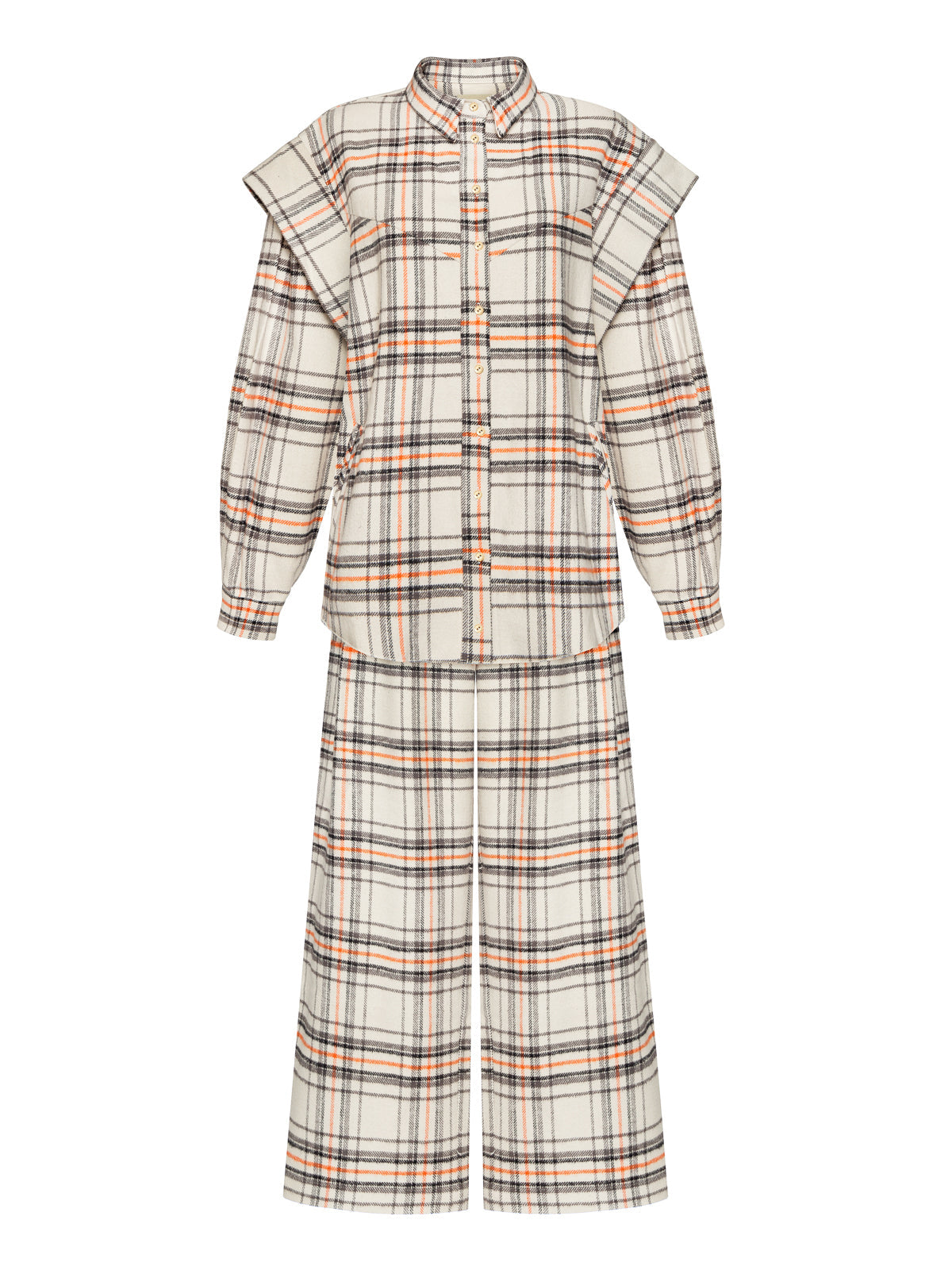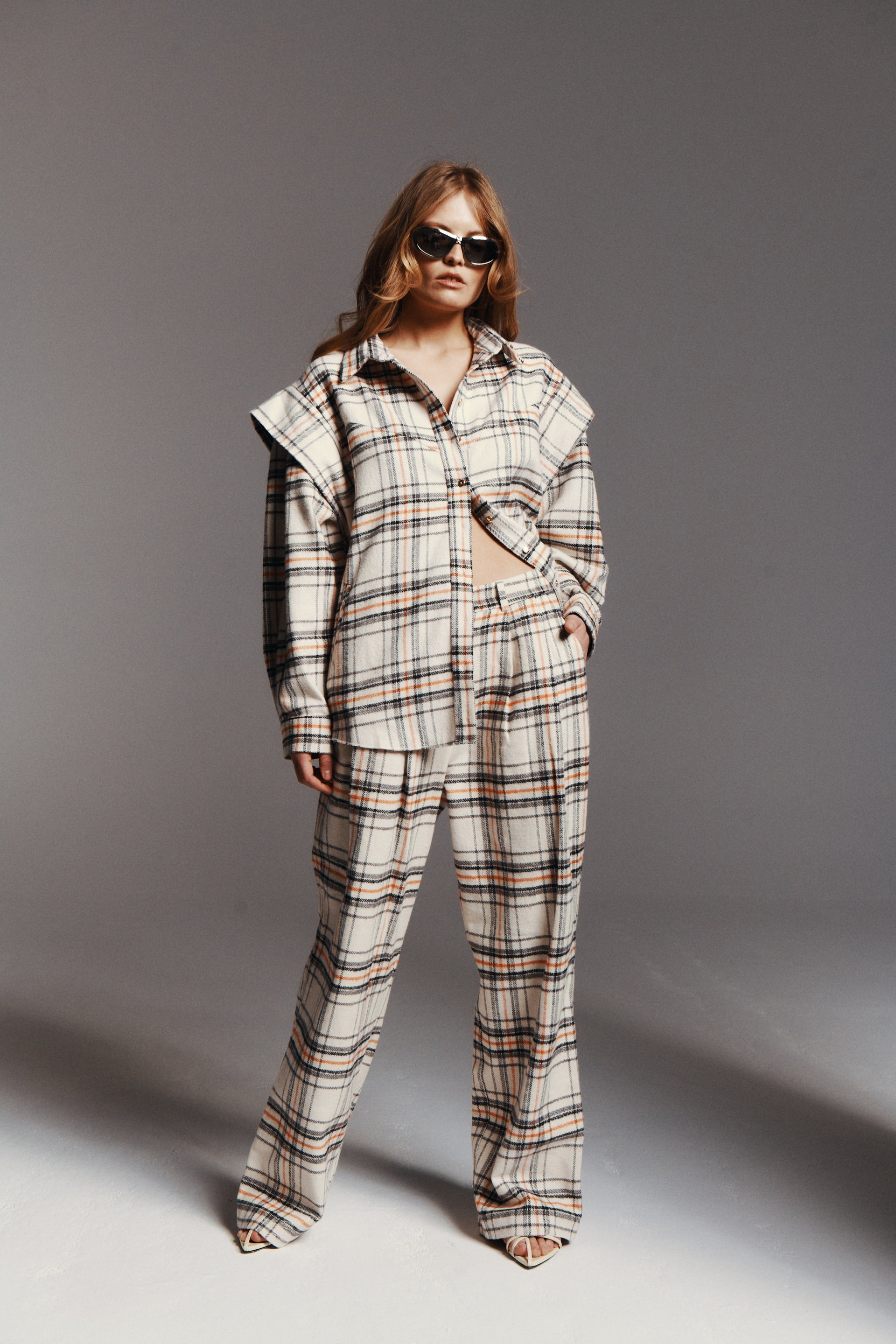 Spodnie z szerokimi nogawkami w klasyczny wzór kratki, w dominujących kolorach bieli, szarości i pomarańczowego akcentu. Wykonane z miękkiego, przyjemnego w dotyku materiału, idealnie sprawdzą się na chłodniejsze dni. Wysoki stan podkreśla talię, a luźny krój zapewnia wygodę i swobodę ruchów. Idealne do casualowych stylizacji z golfem i sneakersami.