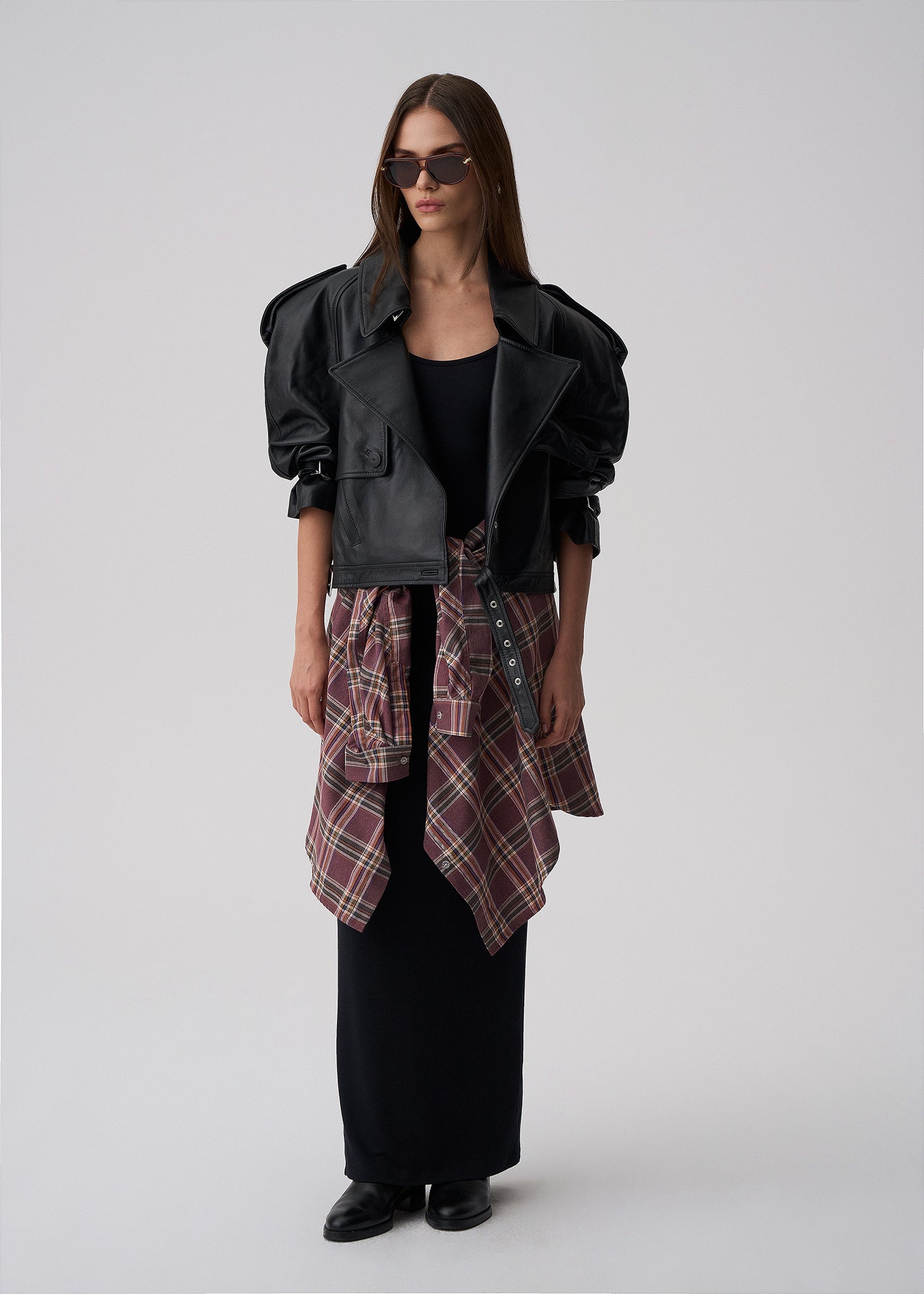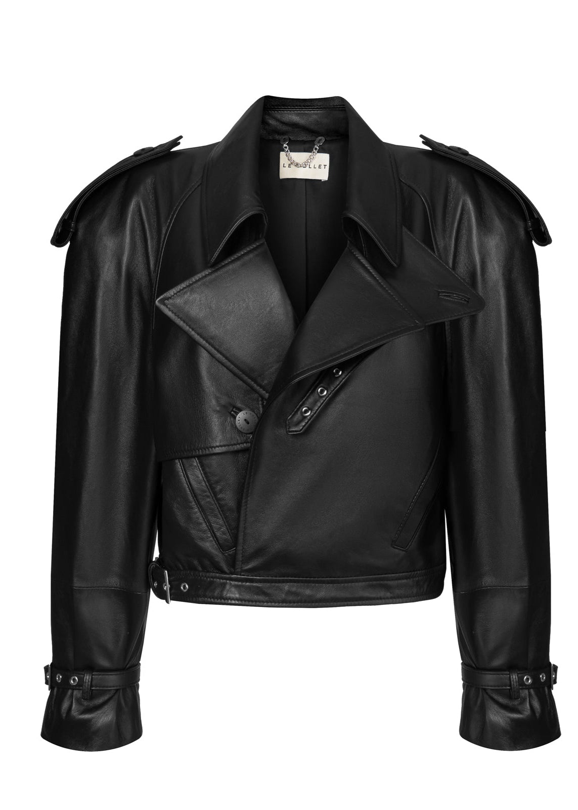 Klero to stylowy model kurtki wykonany z wysokiej jakości skóry w odcieniu głębokiej czerni. Charakteryzuje się asymetrycznym zapięciem na guziki, szerokim kołnierzem oraz paskiem w talii, który podkreśla sylwetkę. Dodatkowym akcentem są ozdobne klapy na ramionach oraz mankiety regulowane za pomocą pasków. Projekt ten idealnie wpisuje się w nowoczesny, miejski styl.