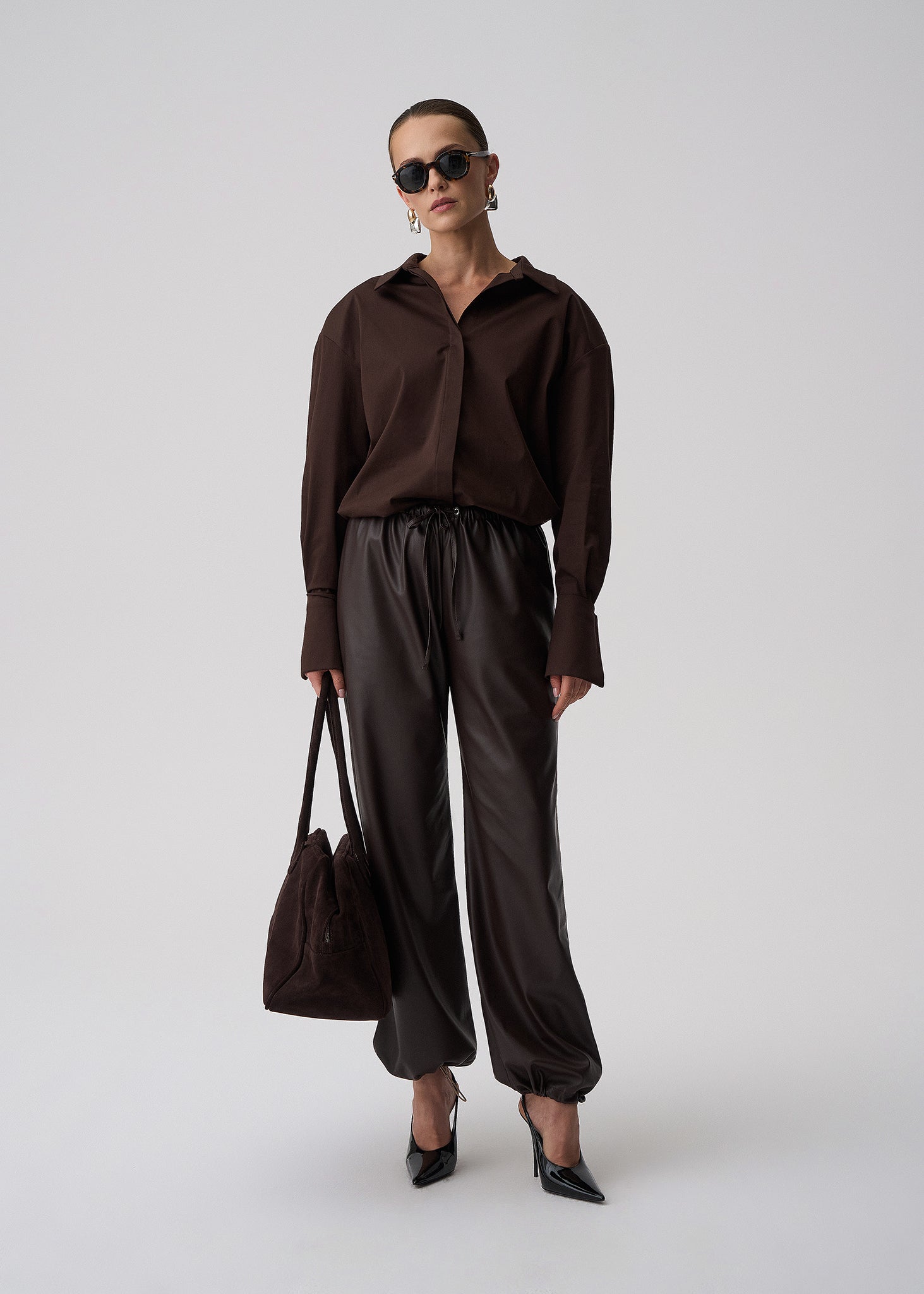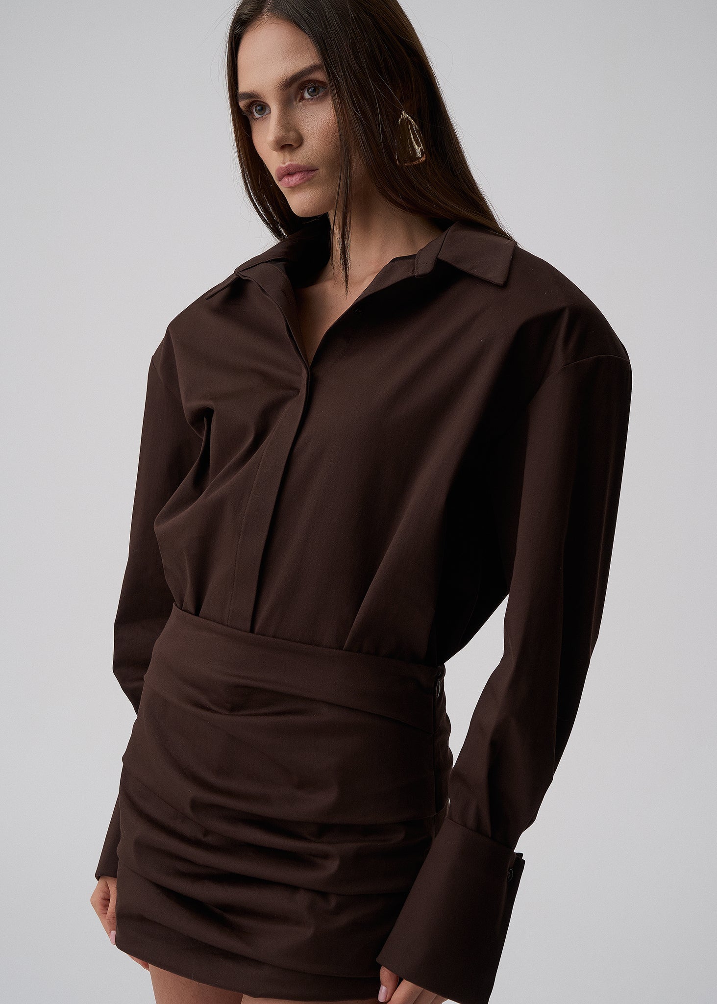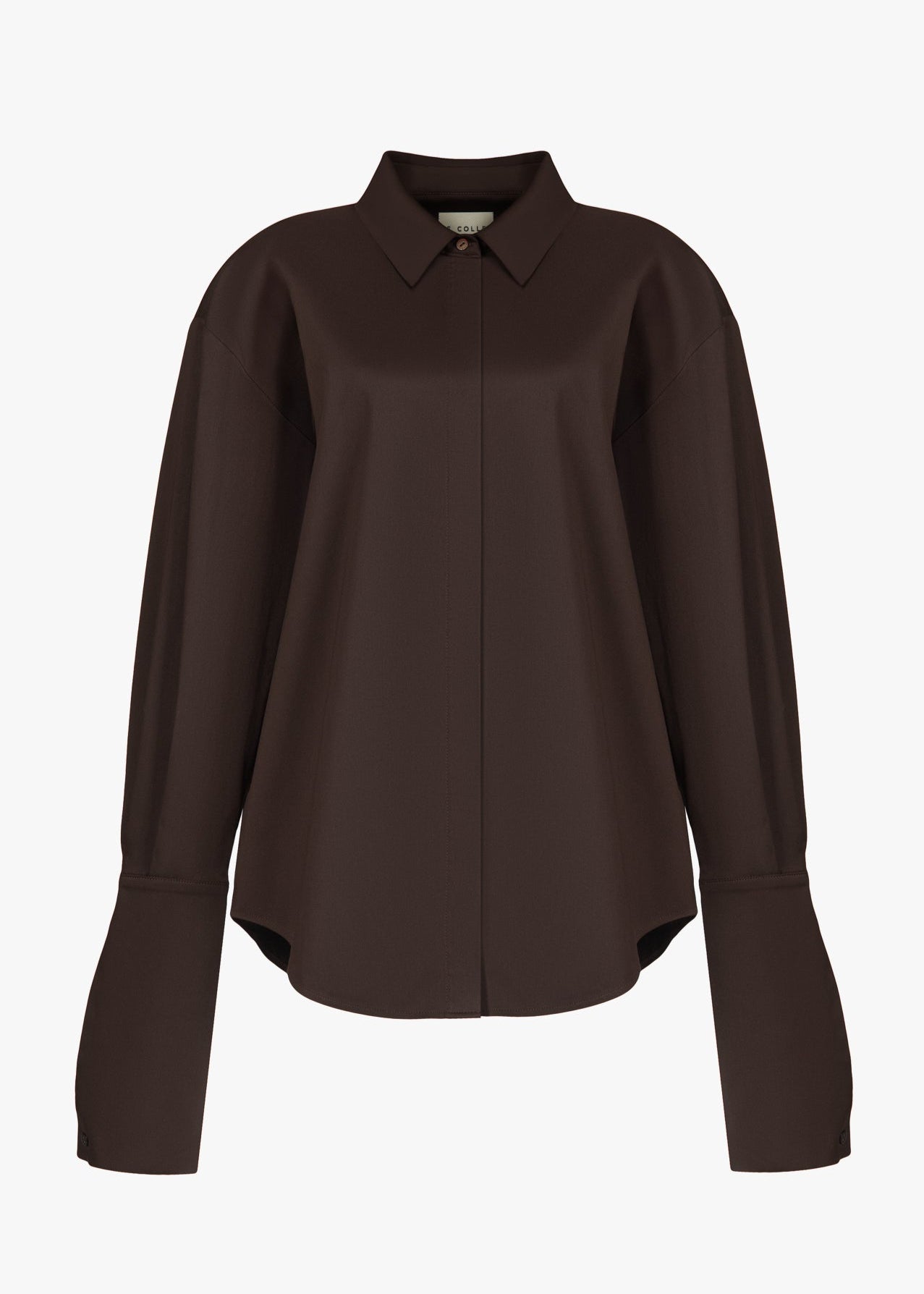 Minimalistyczna koszula w odcieniu głębokiej czekolady, utrzymana w oversize’owym kroju. Luźna linia z obniżonymi ramionami nadaje sylwetce lekkości, a przedłużone mankiety dodają całości wyrazistego charakteru. Ukryta listwa guzikowa podkreśla elegancki, czysty design.
