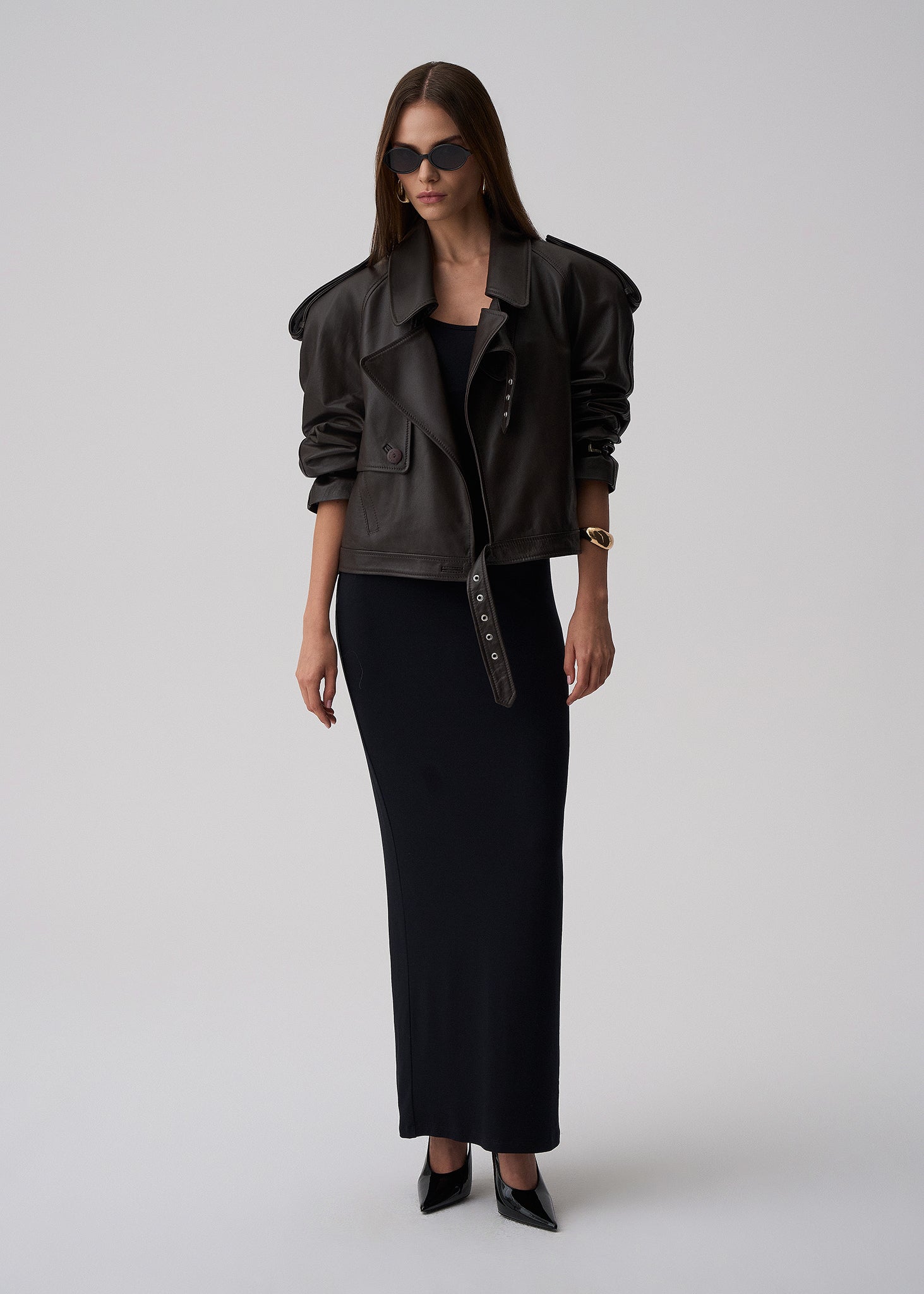 Klero to kurtka wykonana z wysokiej jakości skóry w odcieniu czekoladowym. Charakteryzuje się asymetrycznym zapięciem na guziki, szerokim kołnierzem oraz paskiem w talii, który podkreśla sylwetkę. Dodatkowym akcentem są ozdobne klapy na ramionach oraz mankiety regulowane za pomocą pasków. Idealnie wpisuje się w elegancki, ale jednocześnie nowoczesny styl.