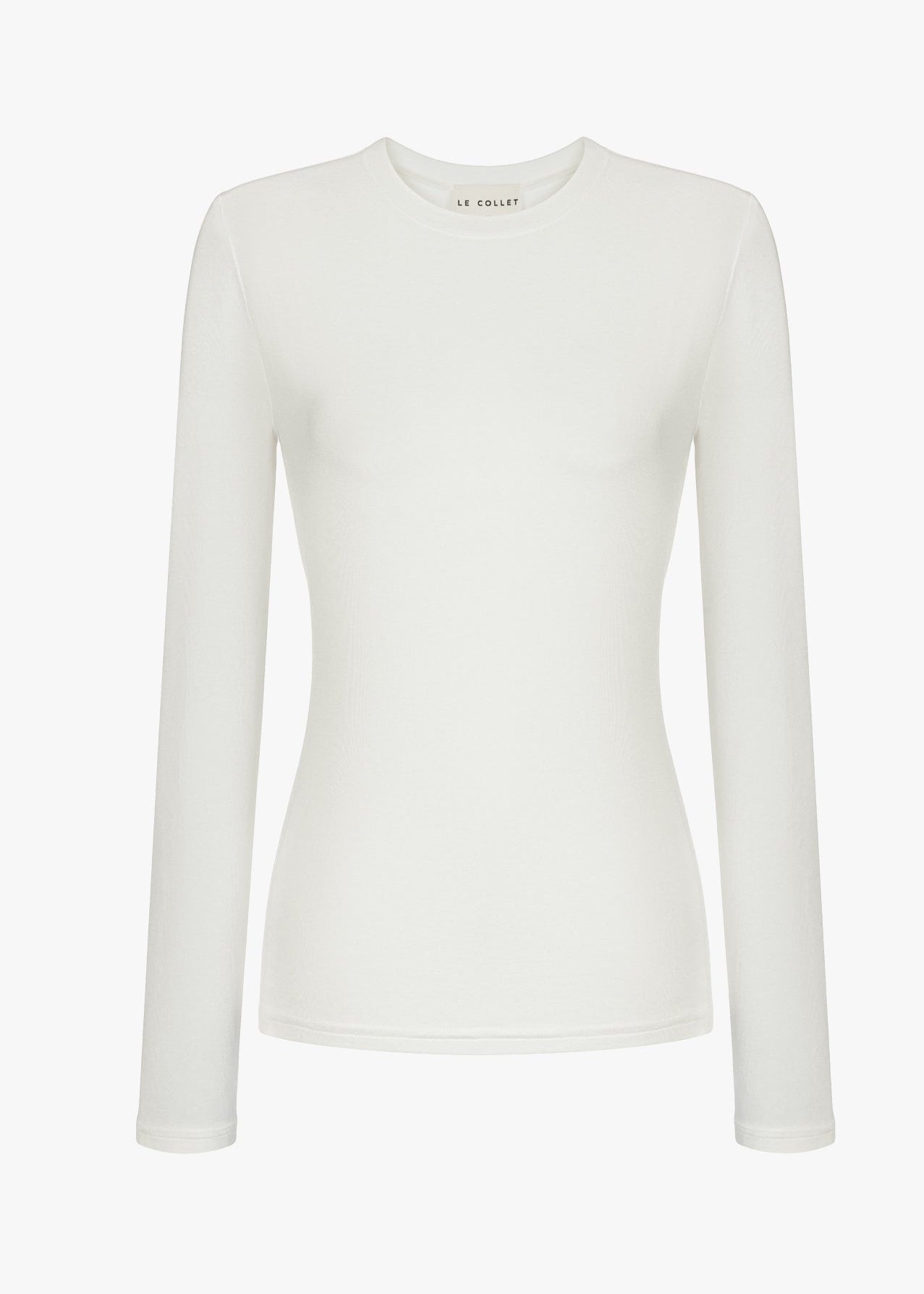 Jasny longsleeve o dopasowanym kroju. Wykonany z miękkiego, przyjemnego w dotyku materiału. Okrągły dekolt i przylegające, proste rękawy wysmuklą optycznie sylwetkę. Idealnie sprawdzi się jako baza pod kurtki lub marynarki.