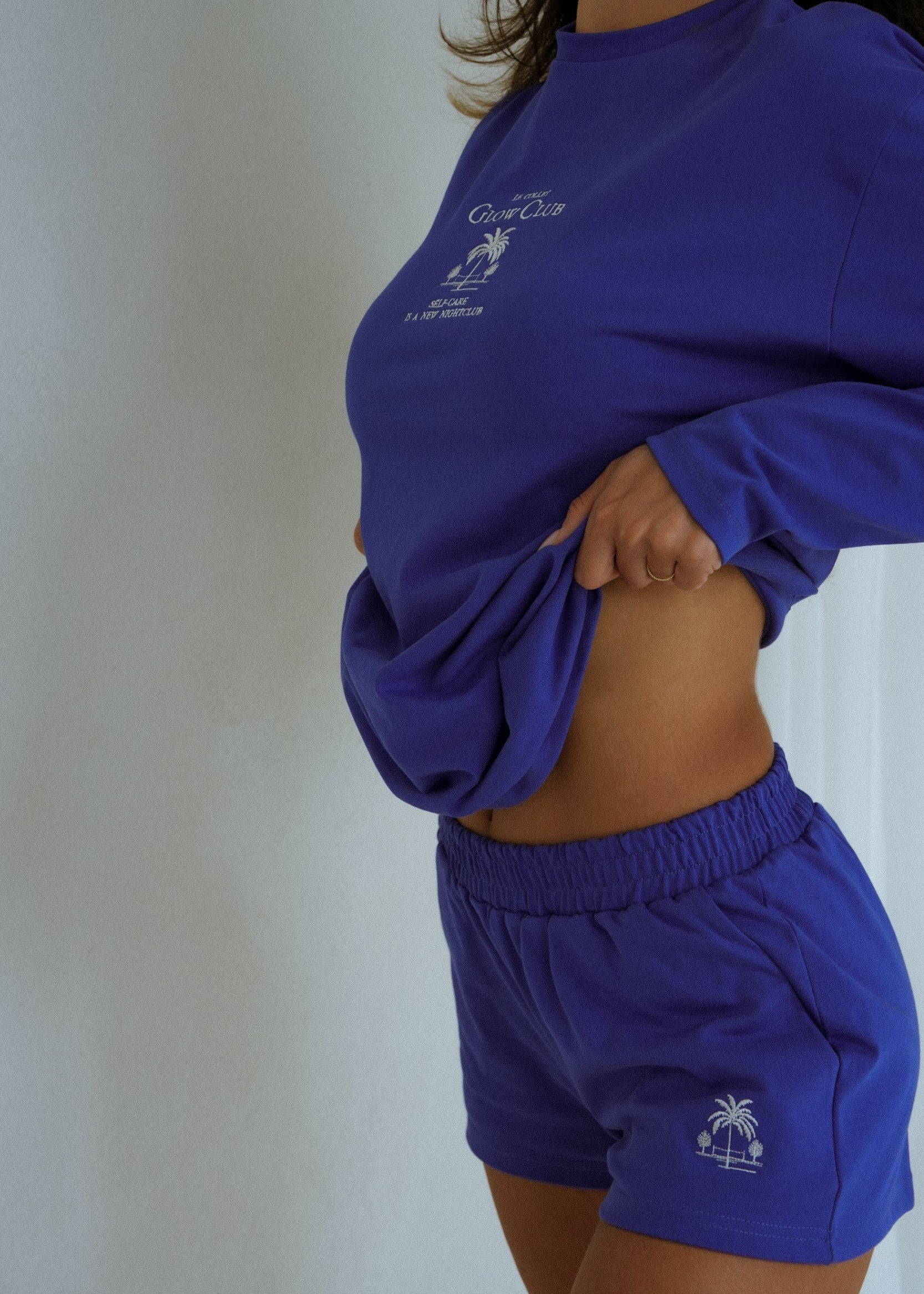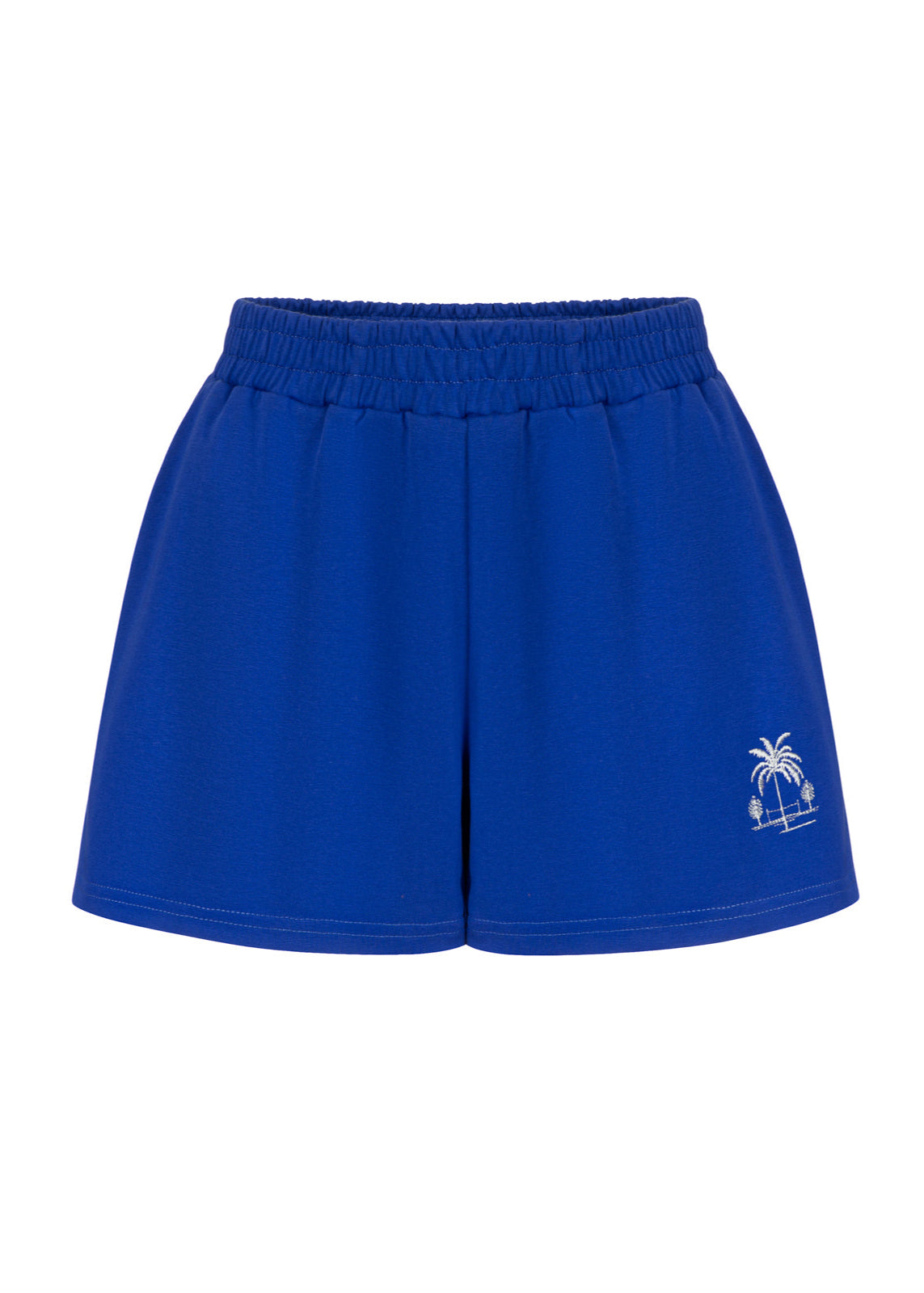 Szorty w kobaltowym odcieniu. Subtelny haft z palmą nadaje im wakacyjny, beztroski charakter. Bezpieczna długość i gumka w talii zapewniają wygodę w użytkowaniu. Świetnie sprawdzą się zarówno solo, jak i w komplecie z bluzą w tym samym kolorze.