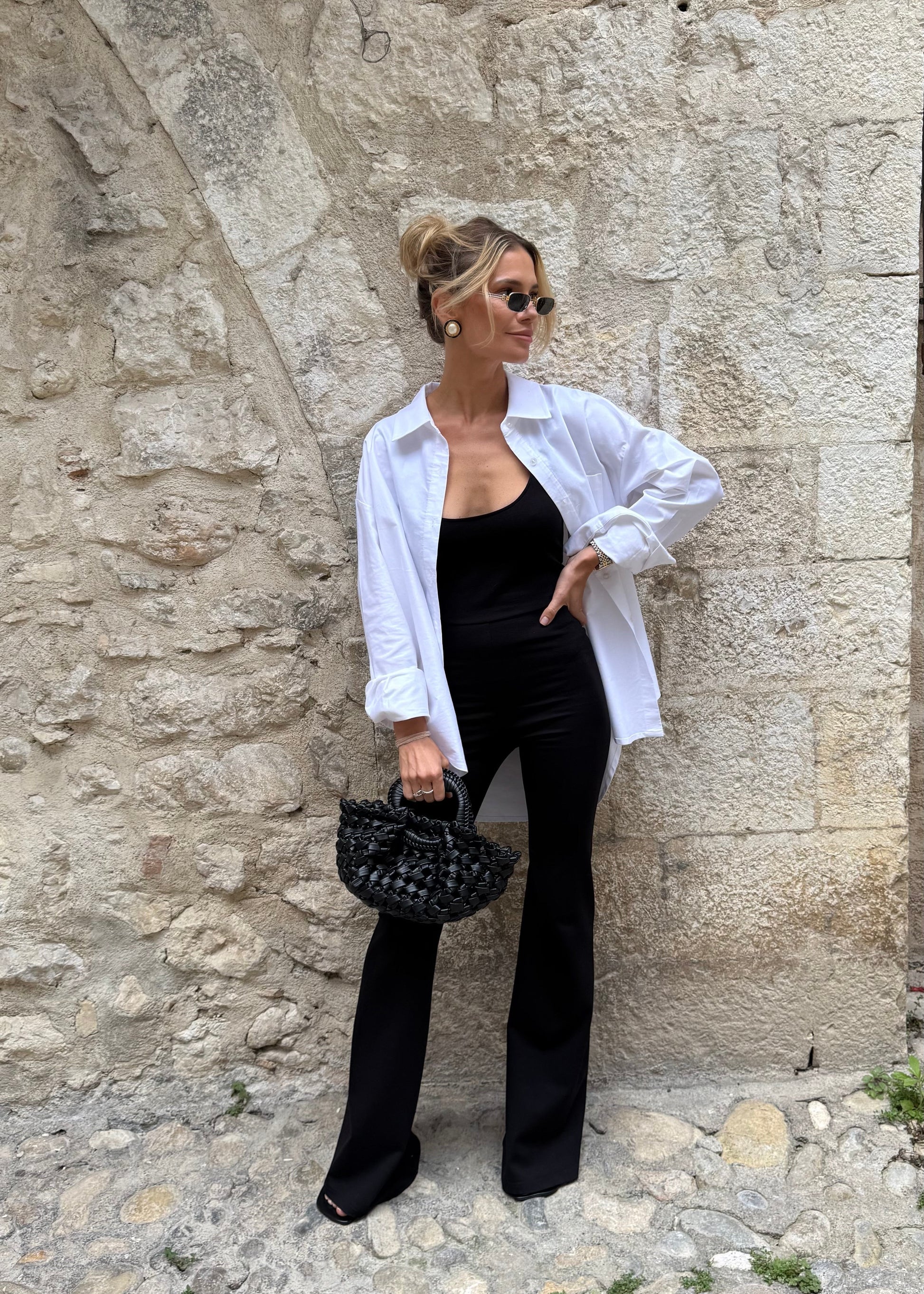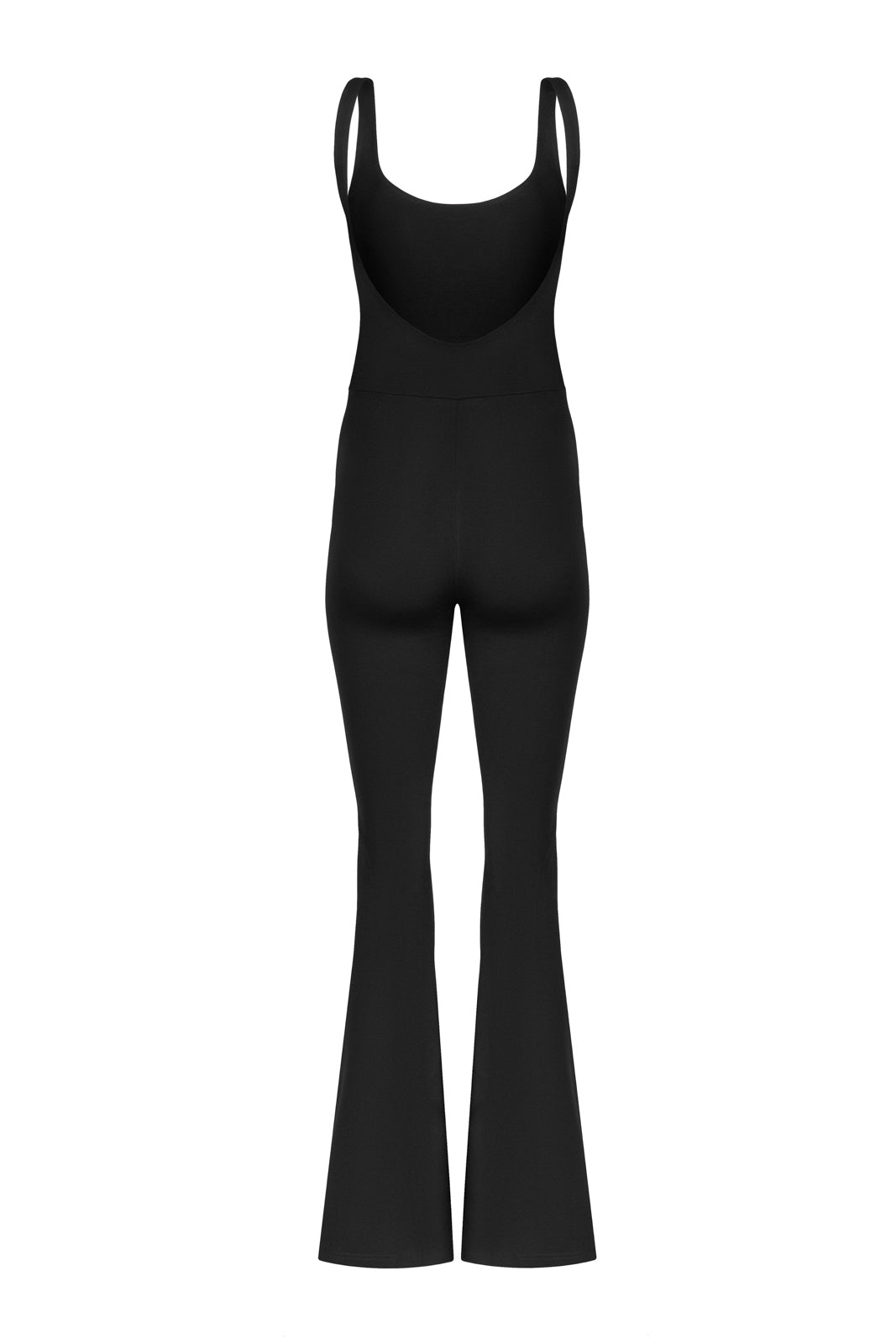 Stylowy czarny kombinezon z wiskozą o dopasowanym kroju z szerokimi nogawkami i głębokim wycięciem na plecach. Materiał delikatnie modeluje sylwetkę, a subtelne przeszycie w talii definiuje ją, dzięki czemu sylwetka wygląda bardziej kobieco. Model ten idealnie sprawdzi się zarówno na eleganckie wyjścia, jak i w miejskich stylizacjach dzięki zestawieniu np. z oversize’ową koszulą.