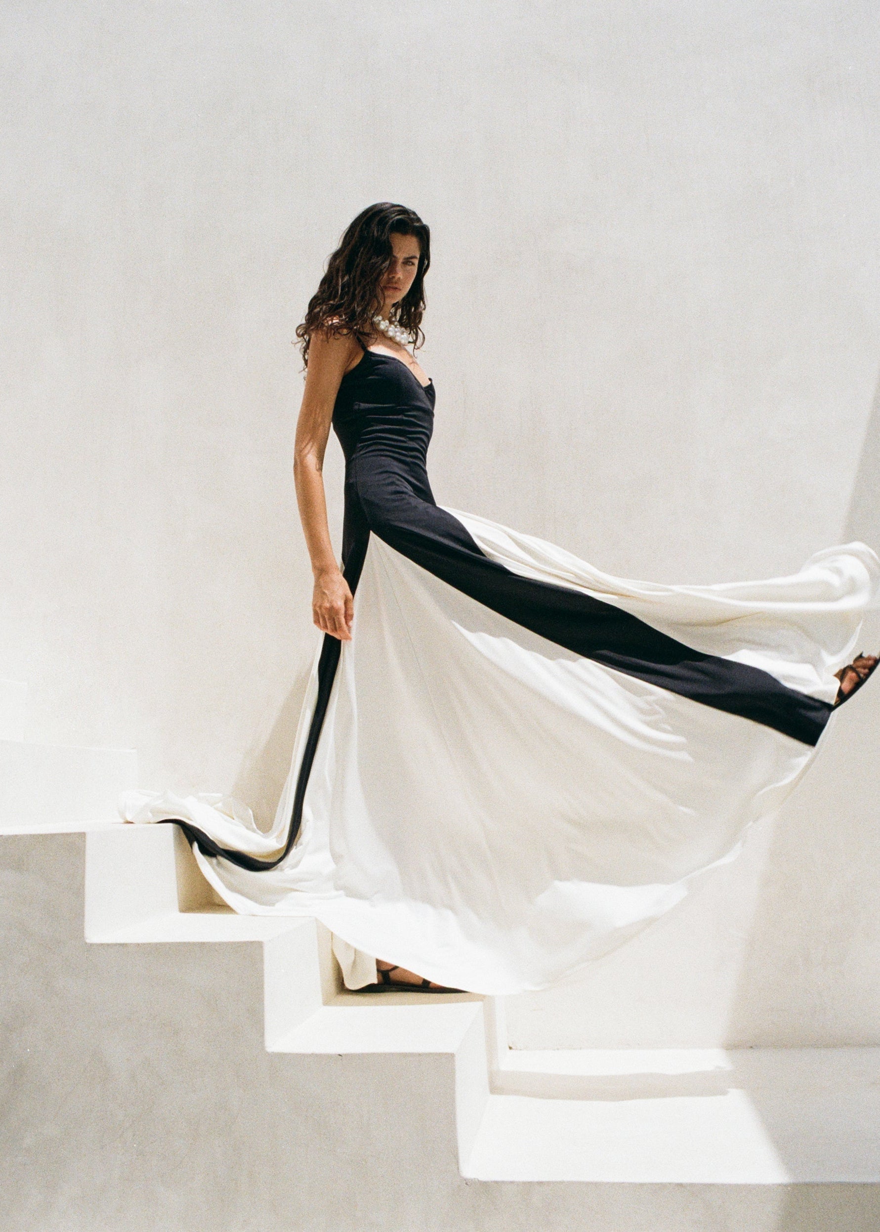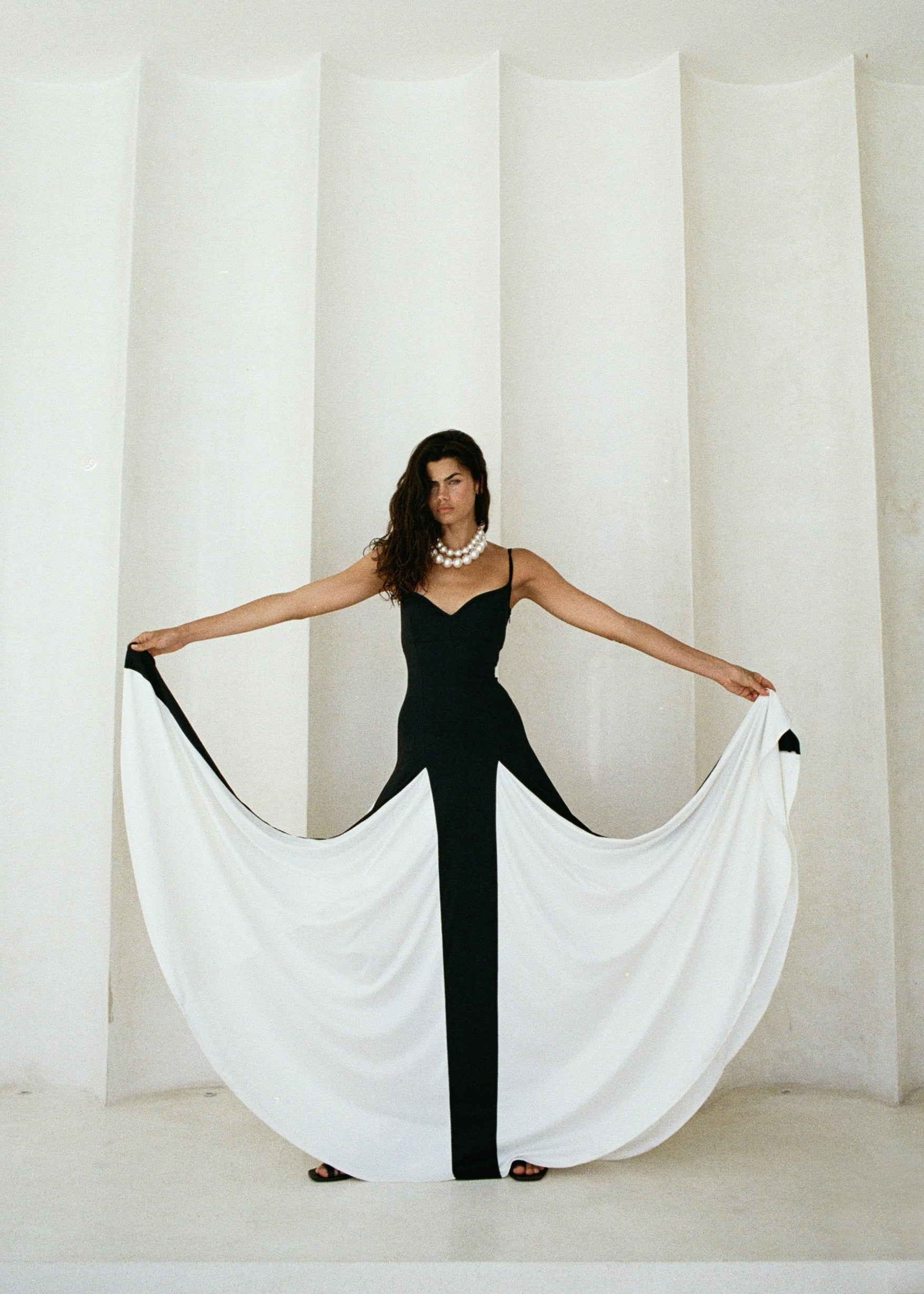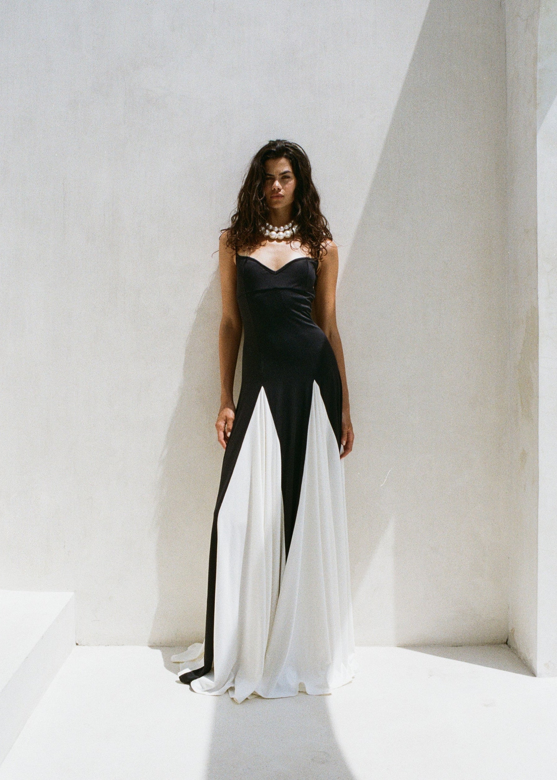 Sukienka o wyjątkowym, graficznym kontraście czerni i bieli, która natychmiast przyciąga uwagę. Gorsetowa góra z subtelnym dekoltem i cienkimi ramiączkami pięknie podkreśla linię ramion i szyi. Rozkloszowany dół z kontrastowymi panelami w kolorze ecru tworzy spektakularny efekt w ruchu. To elegancka i nowoczesna propozycja na wyjątkowe okazje.