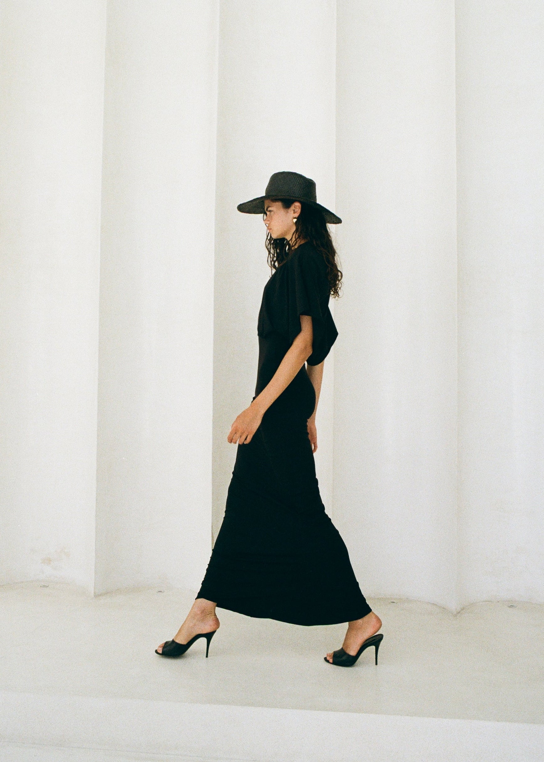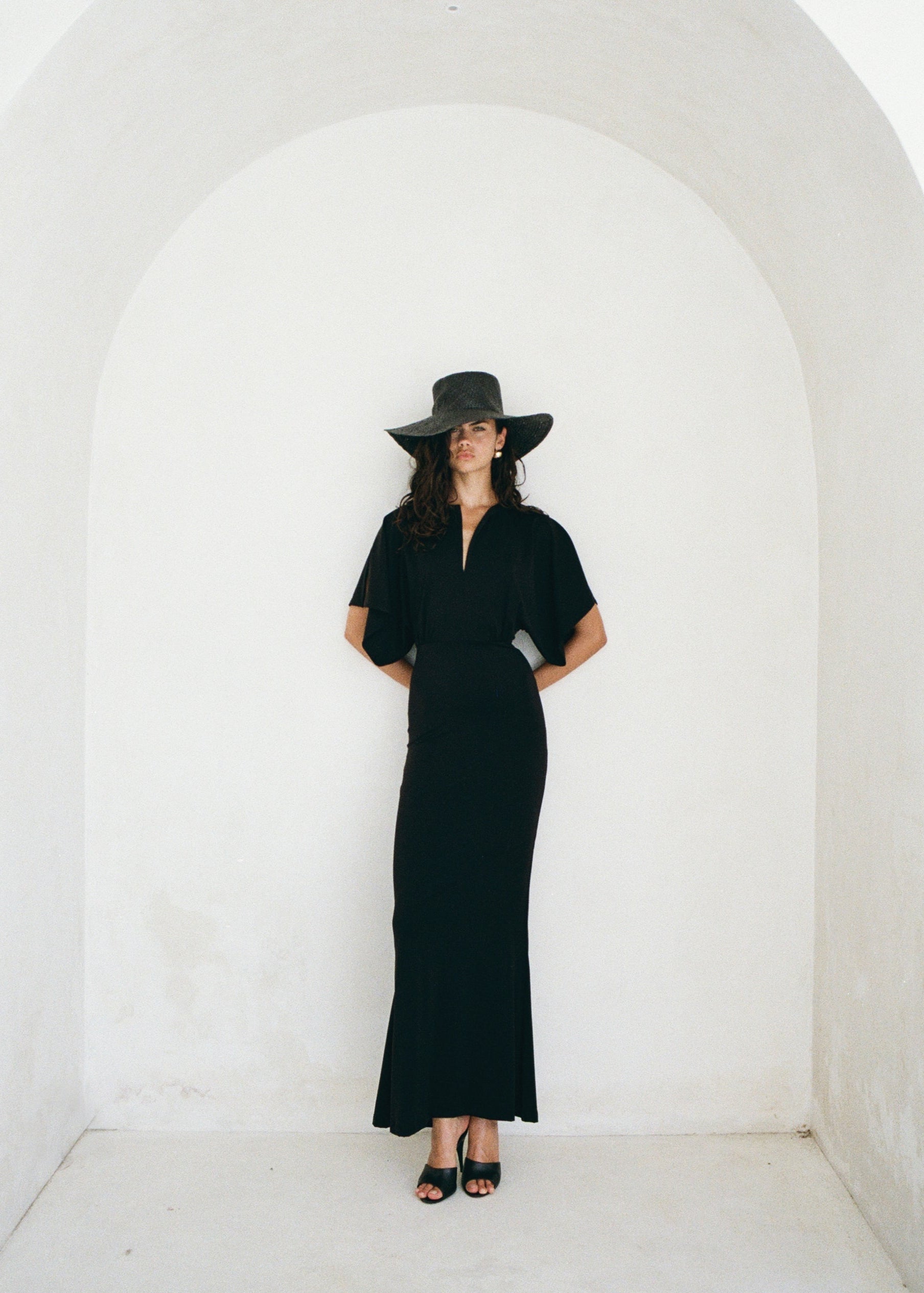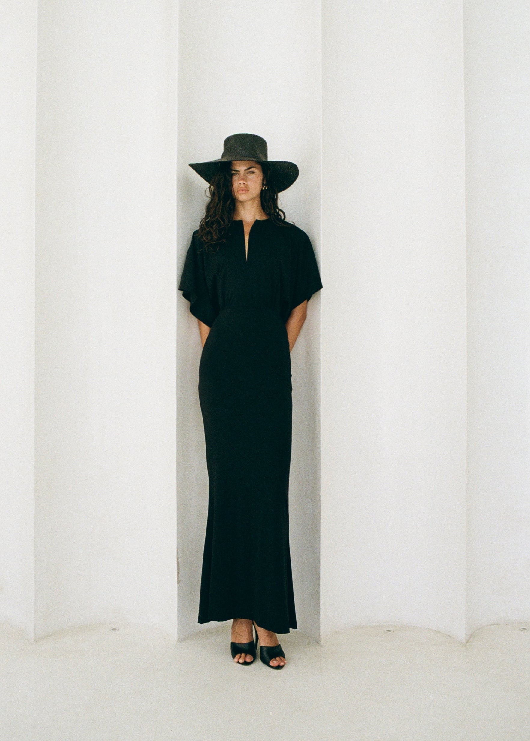 Elegancka czarna sukienka maxi z luźnymi rękawami i subtelnym dekoltem w kształcie litery V to połączenie klasyki i wygody. Dopasowana talia pięknie podkreśla sylwetkę, a zwiewny materiał dodaje lekkości. Idealny wybór na wyjątkowe okazje, by wyróżnić się stylem i kobiecością.