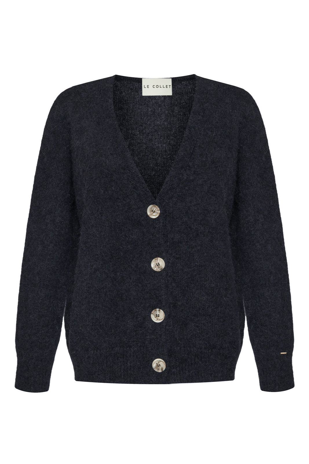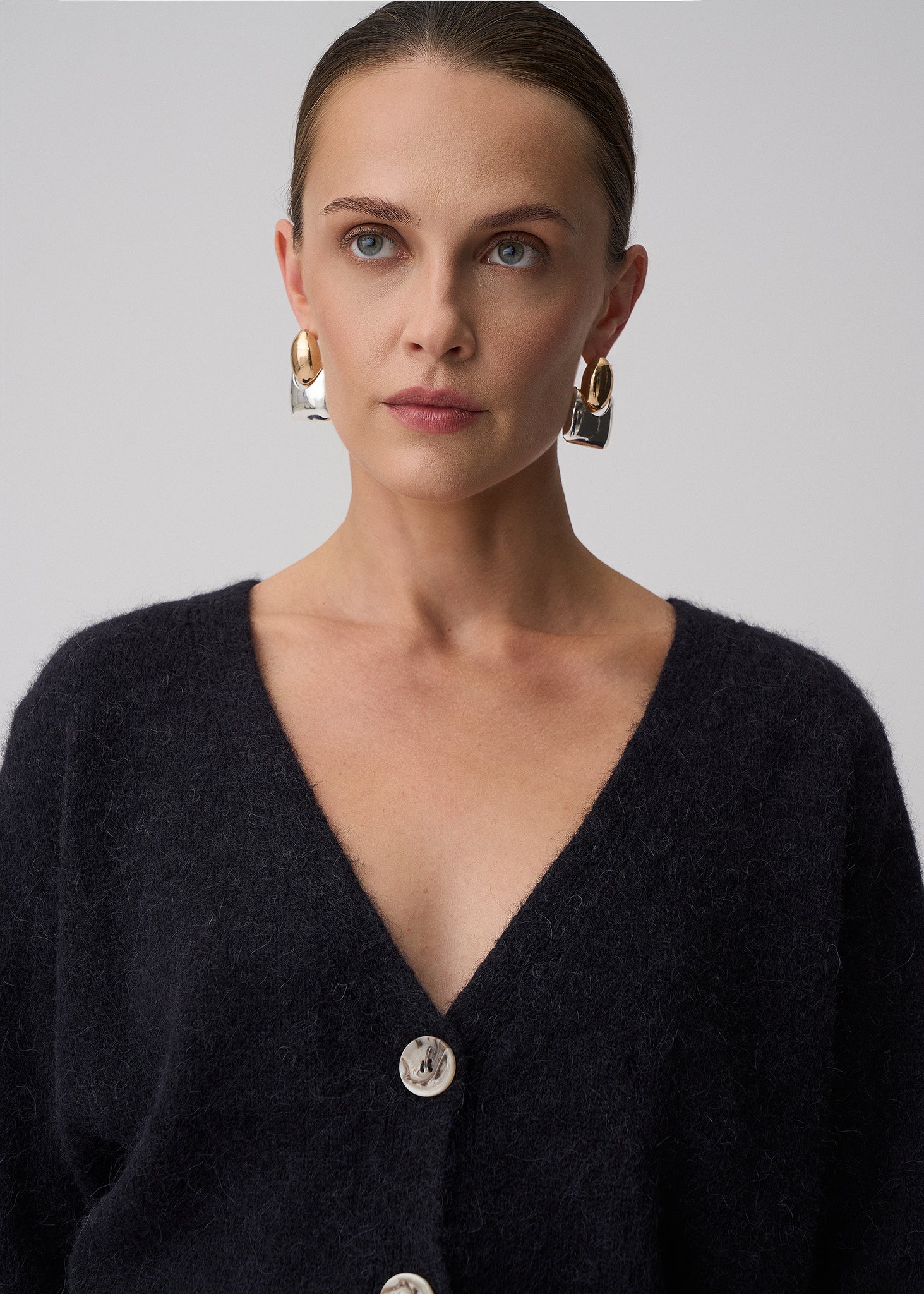 Szary kardigan o luźnym kroju, wykonany z miękkiego i przyjemnego w dotyku materiału. Posiada klasyczny dekolt w kształcie litery "V", który dodaje mu elegancji i uniwersalności. Długie rękawy i subtelne wykończenia sprawiają, że jest idealny na chłodniejsze dni, zapewniając wygodę i styl.