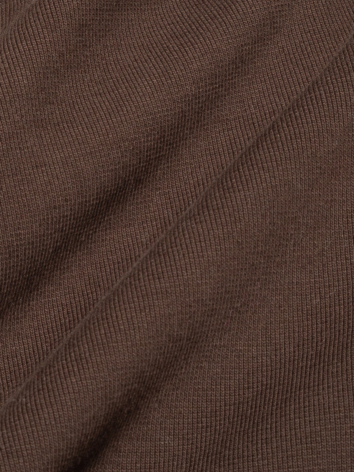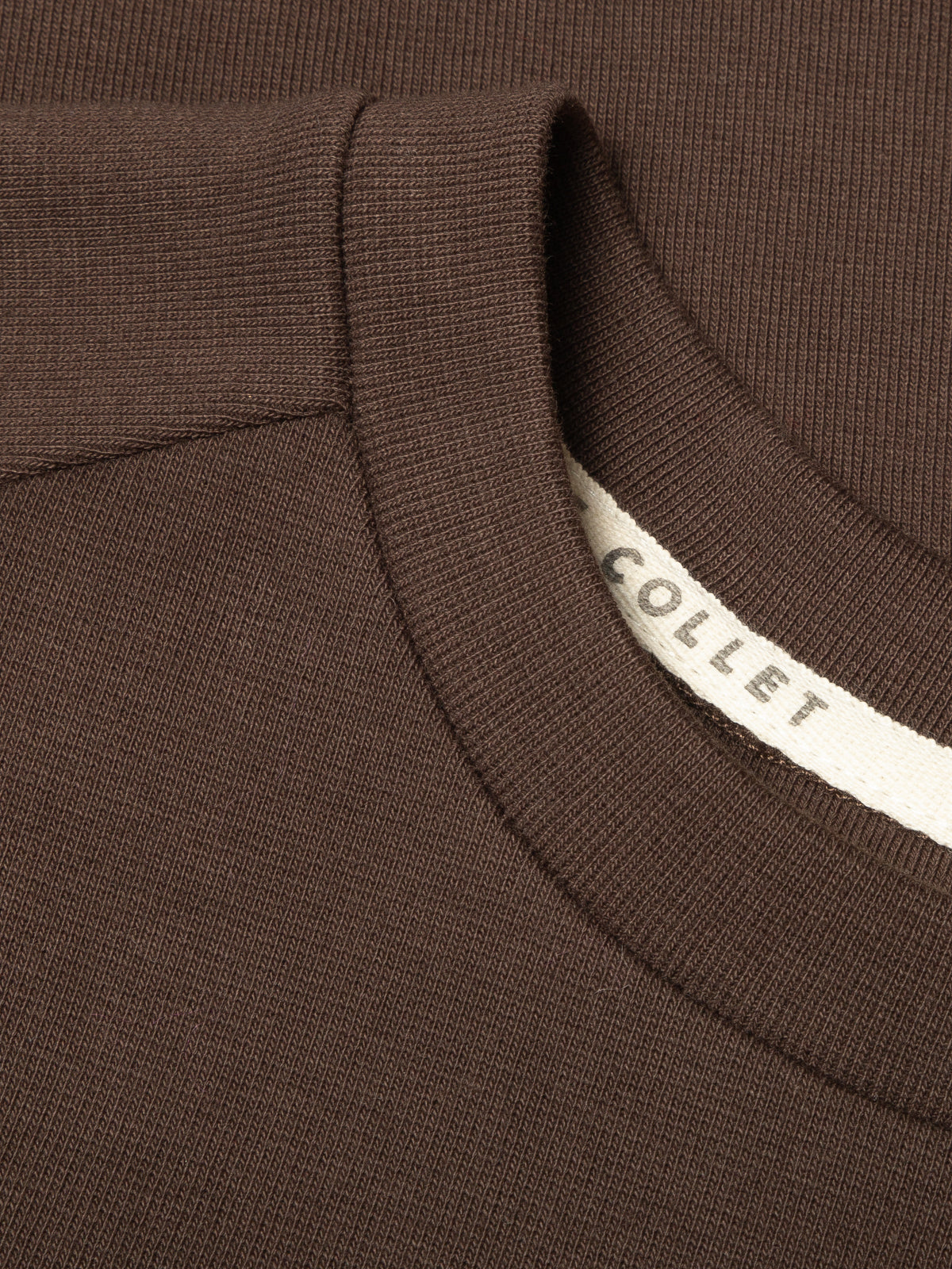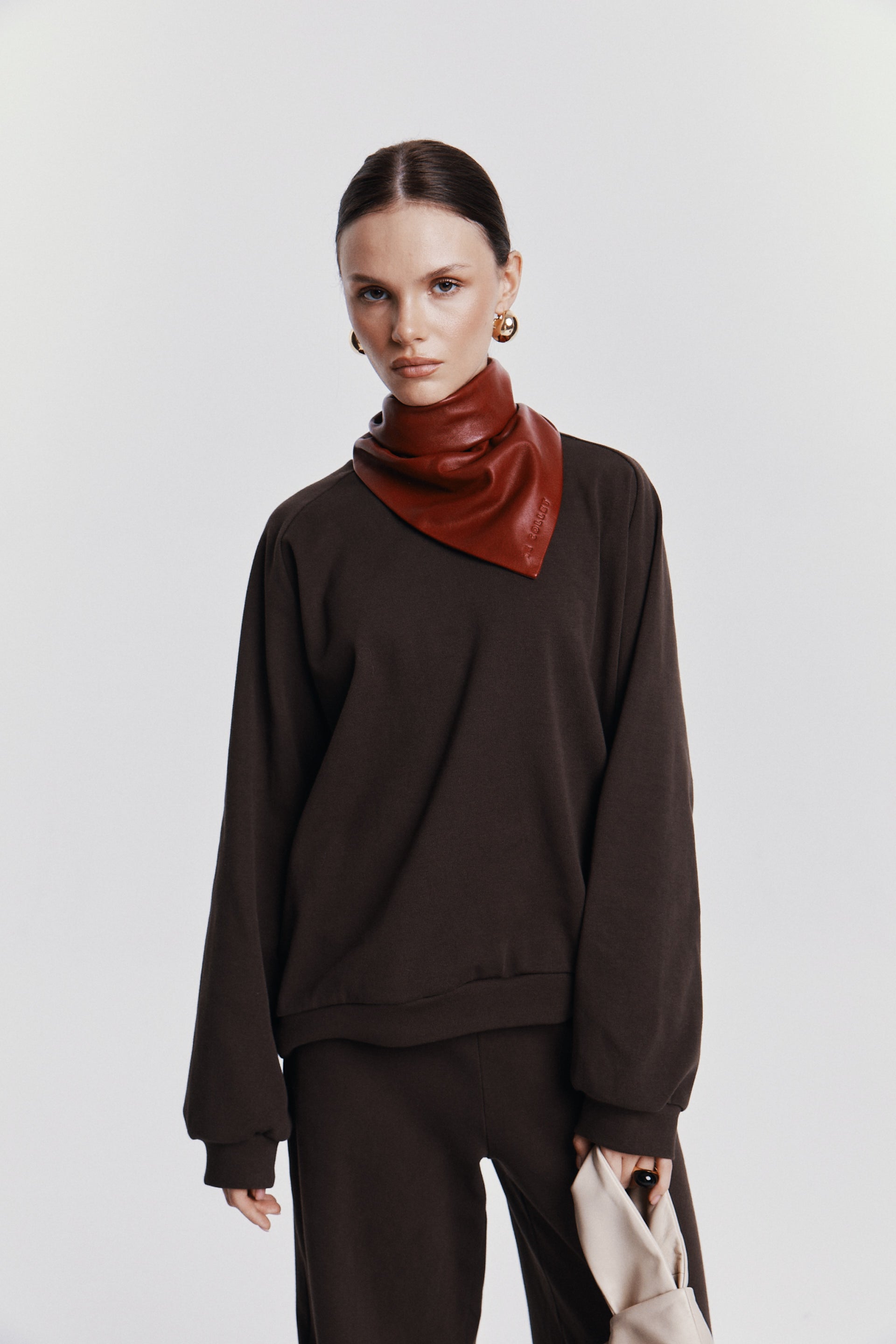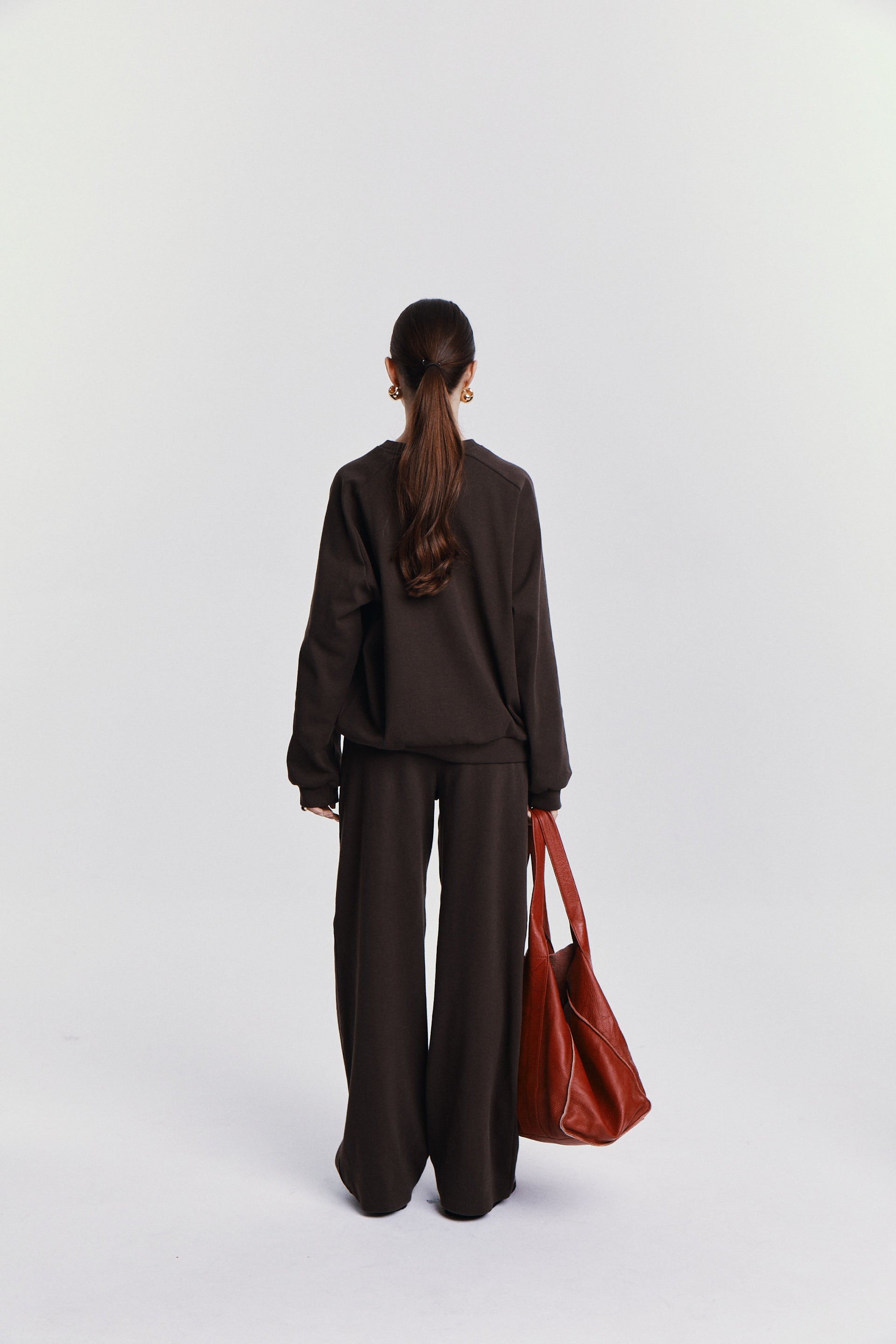 Minimalistyczny, klasyczny model bluzy w odcieniu ciemnobrązowym. Posiada prosty fason z okrągłym dekoltem, raglanowymi rękawami i ściągaczami na mankietach oraz u dołu, co zapewnia wygodę noszenia i dopasowanie. Idealna na codzienne stylizacje, łączy komfort z ponadczasowym stylem.