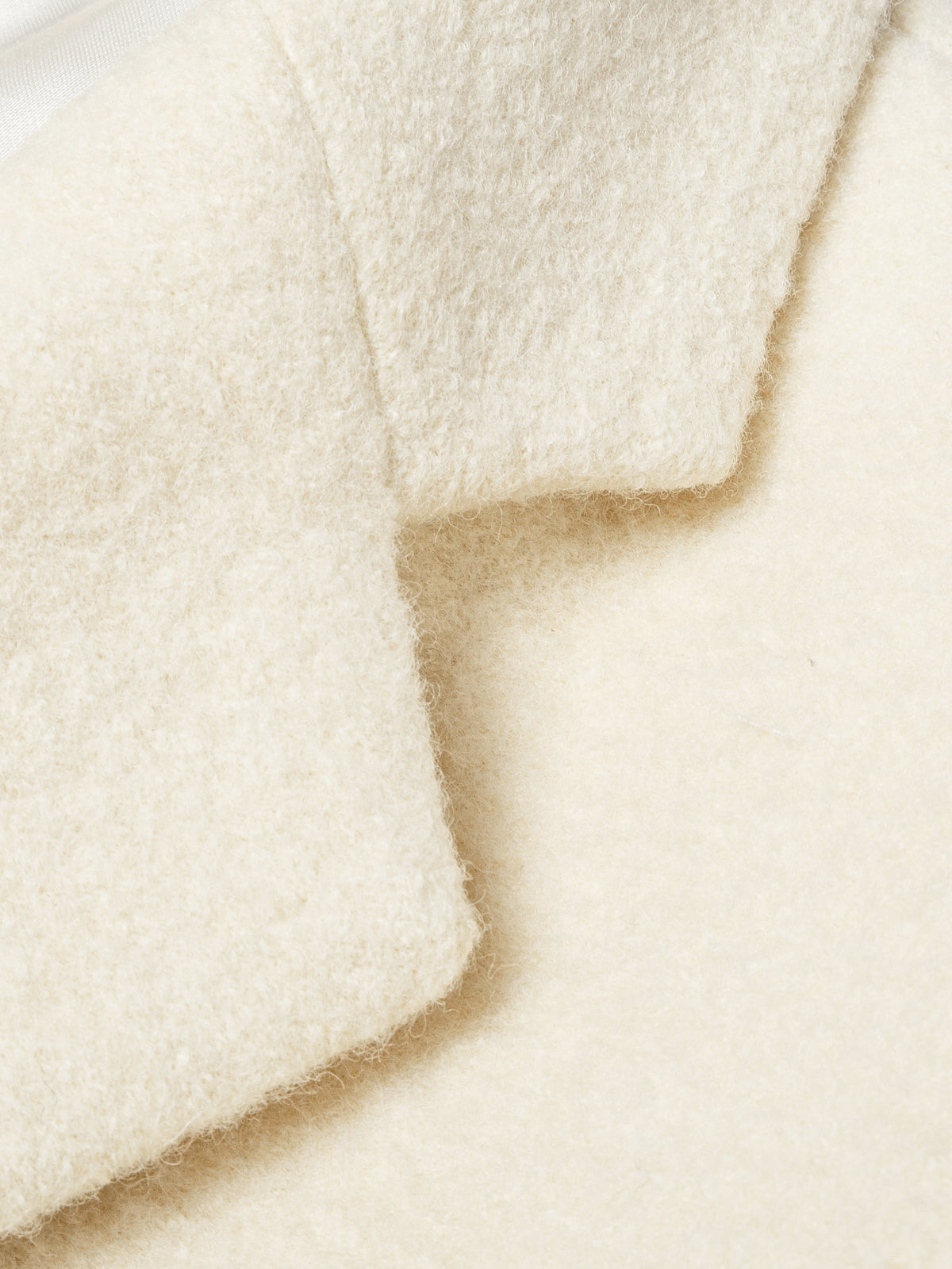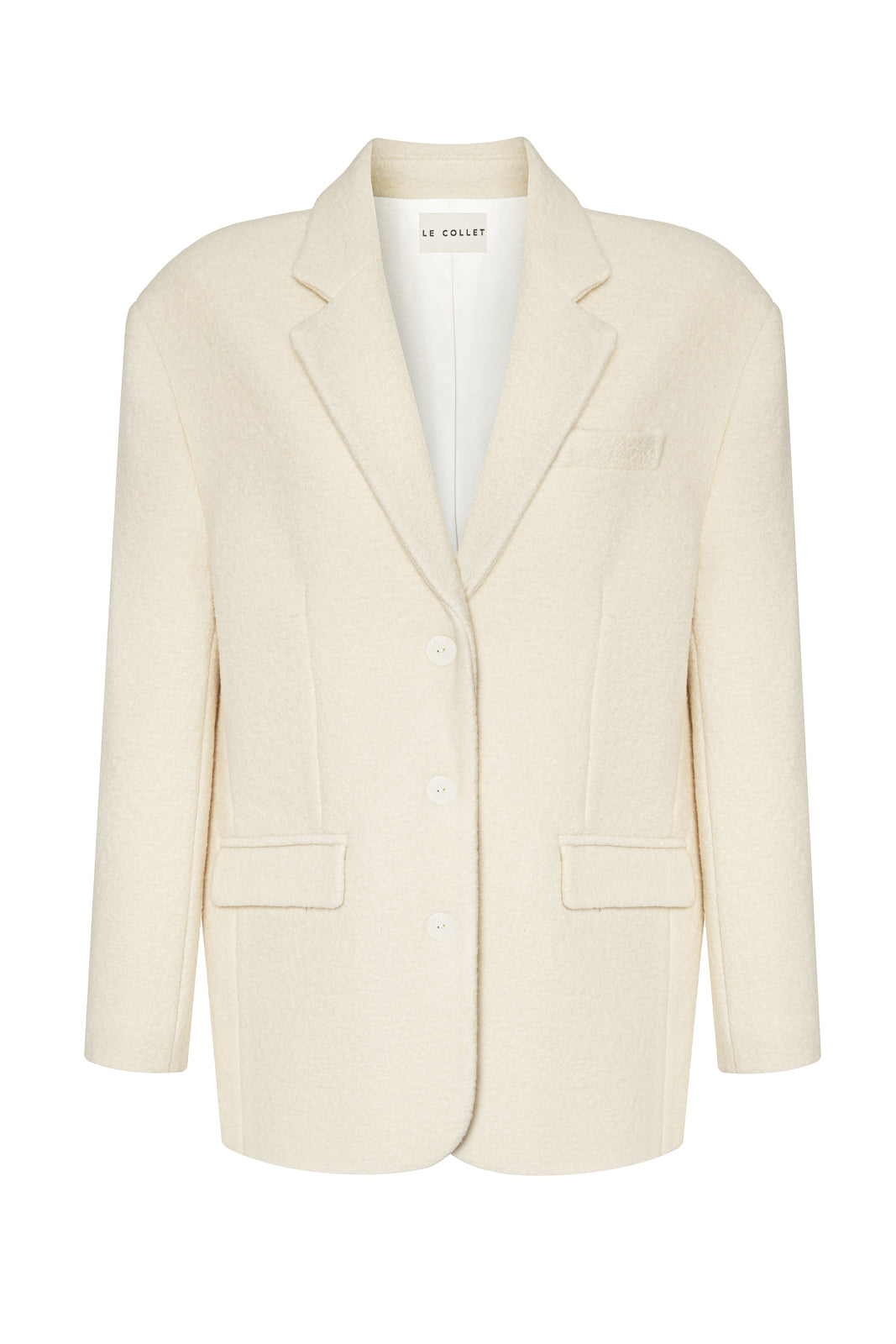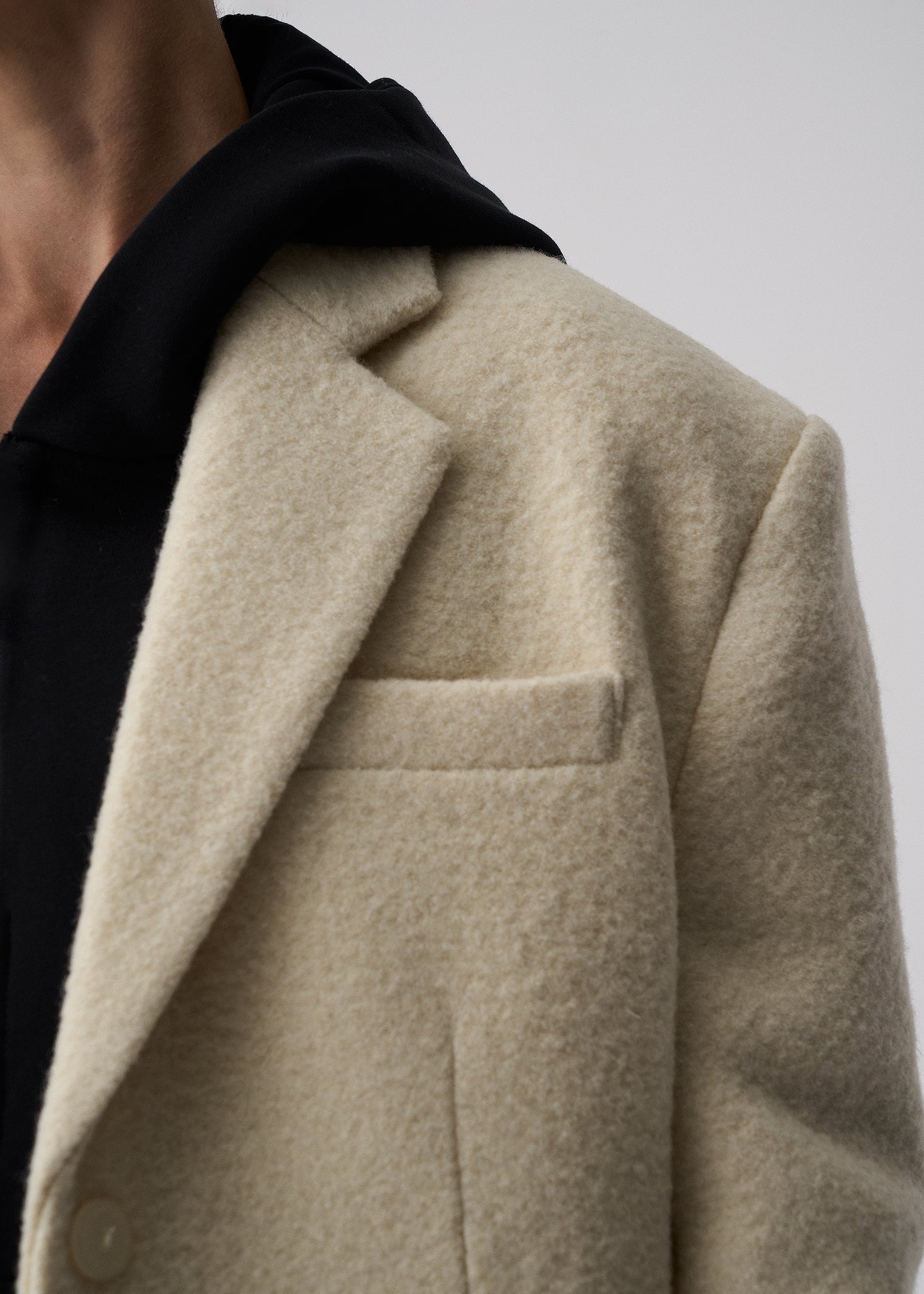 Marynarka Roy to klasyczny, elegancki model w kremowym kolorze. Posiada subtelne poduszki w ramionach, zapięcie na duże, logowane guziki oraz kieszenie z klapkami. Od środka wykończona jest wiskozą satynowaną, zaś zewnętrza stronę pokrywa wełna gotowana, dzięki czemu marynarka jest bardziej zbita i lepiej trzyma ciepło.