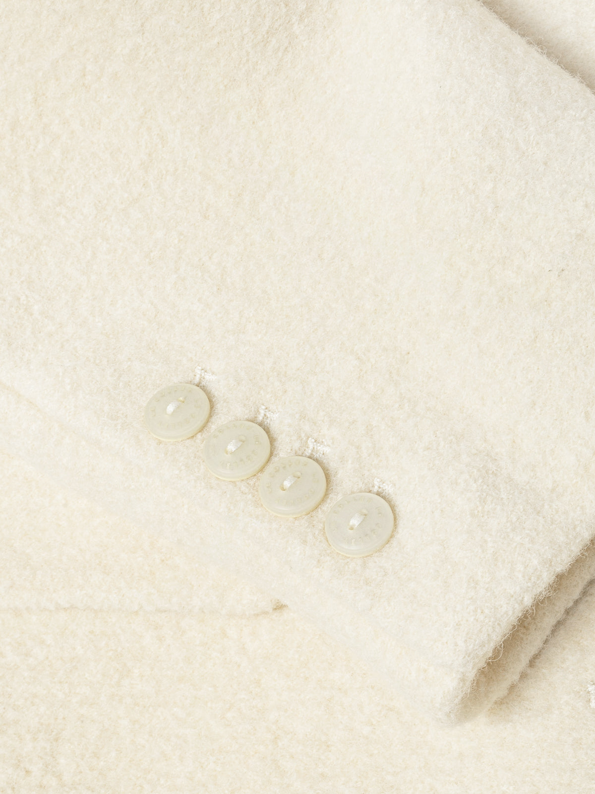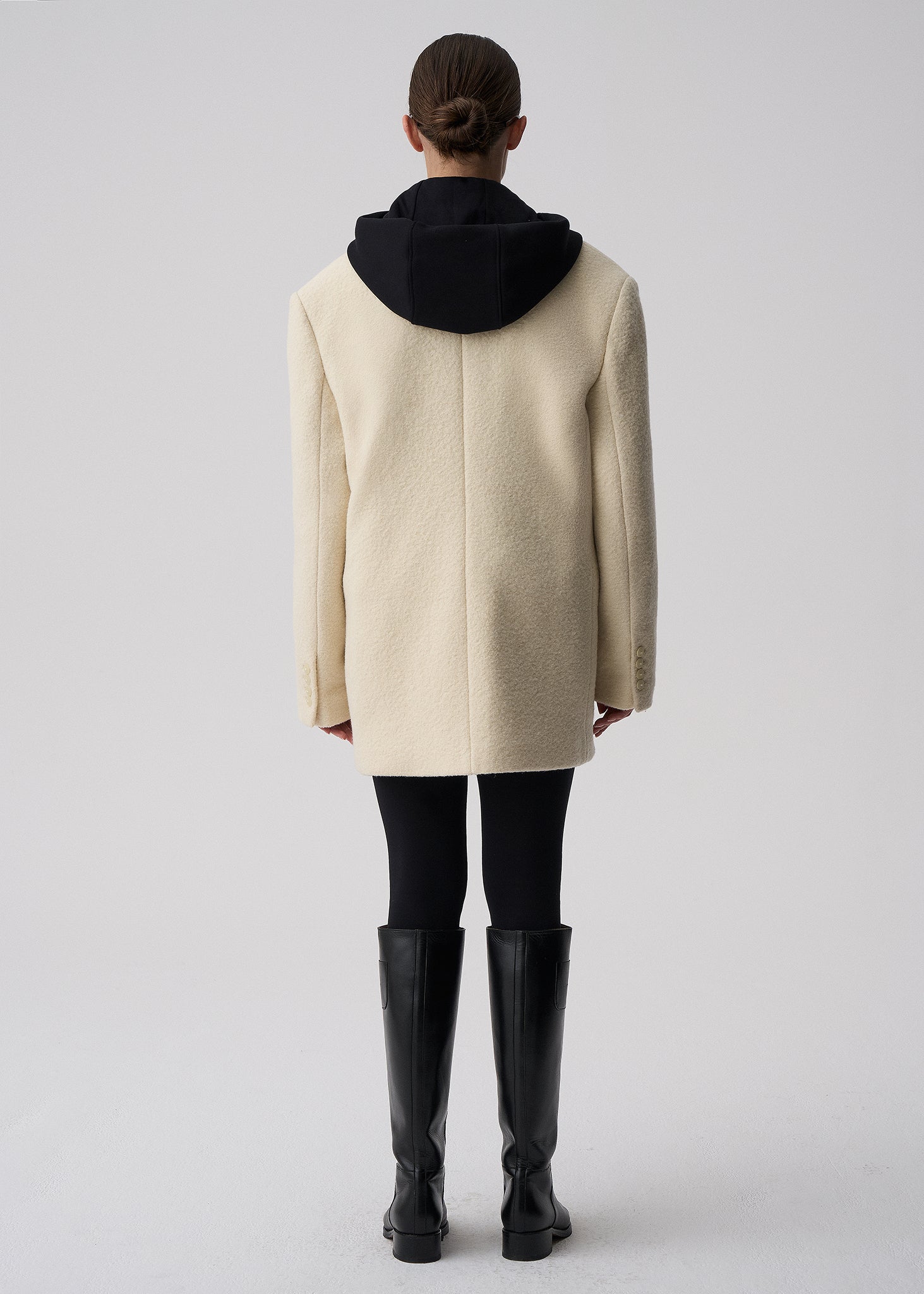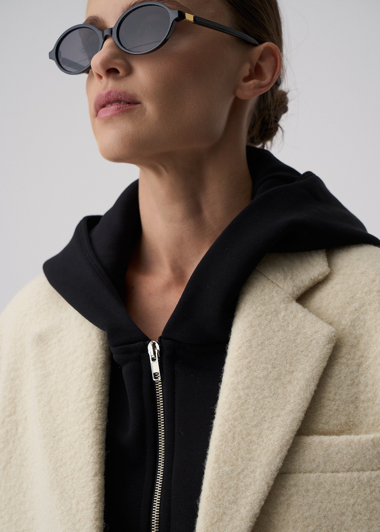 Marynarka Roy to klasyczny, elegancki model w kremowym kolorze. Posiada subtelne poduszki w ramionach, zapięcie na duże, logowane guziki oraz kieszenie z klapkami. Od środka wykończona jest wiskozą satynowaną, zaś zewnętrza stronę pokrywa wełna gotowana, dzięki czemu marynarka jest bardziej zbita i lepiej trzyma ciepło.