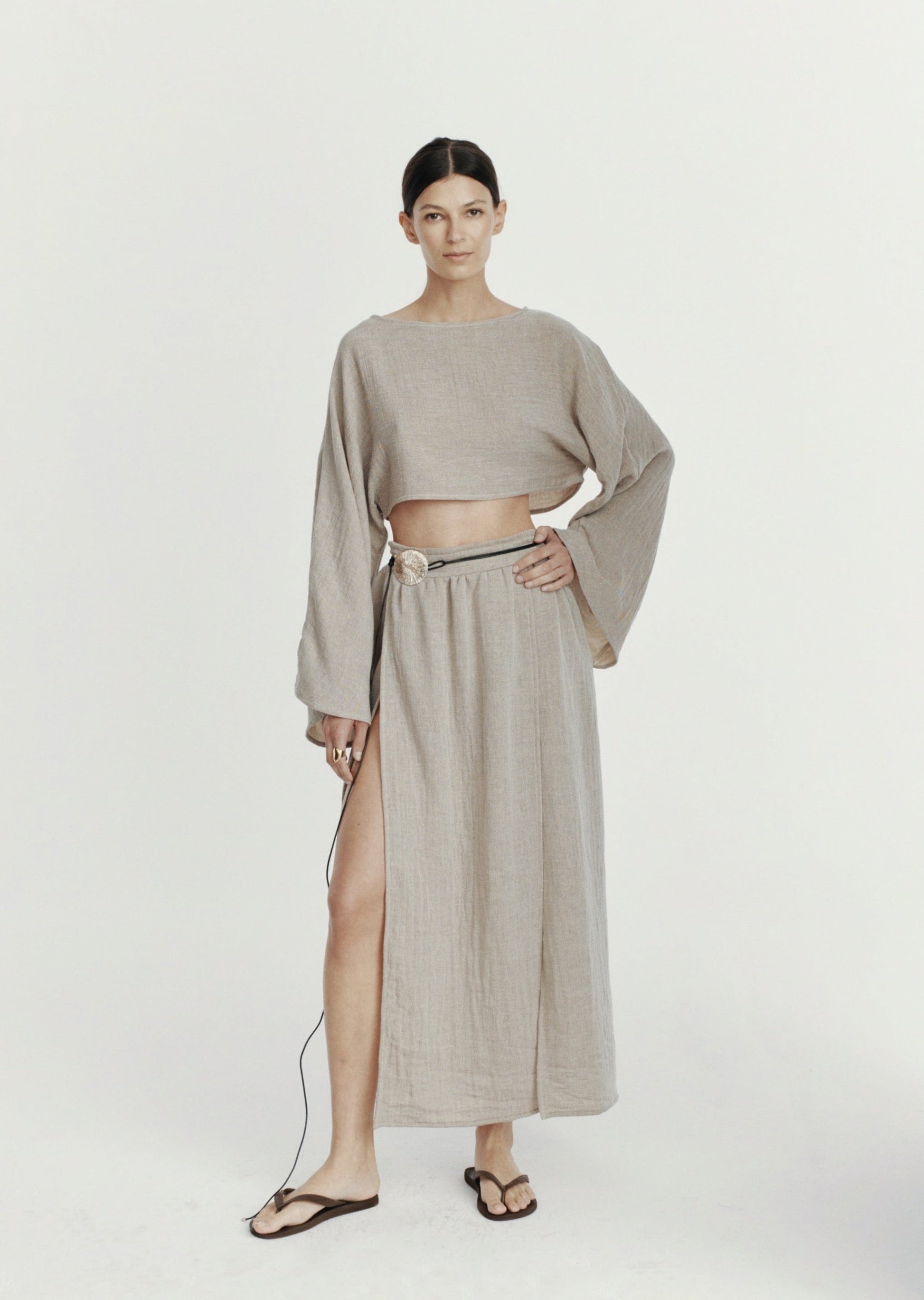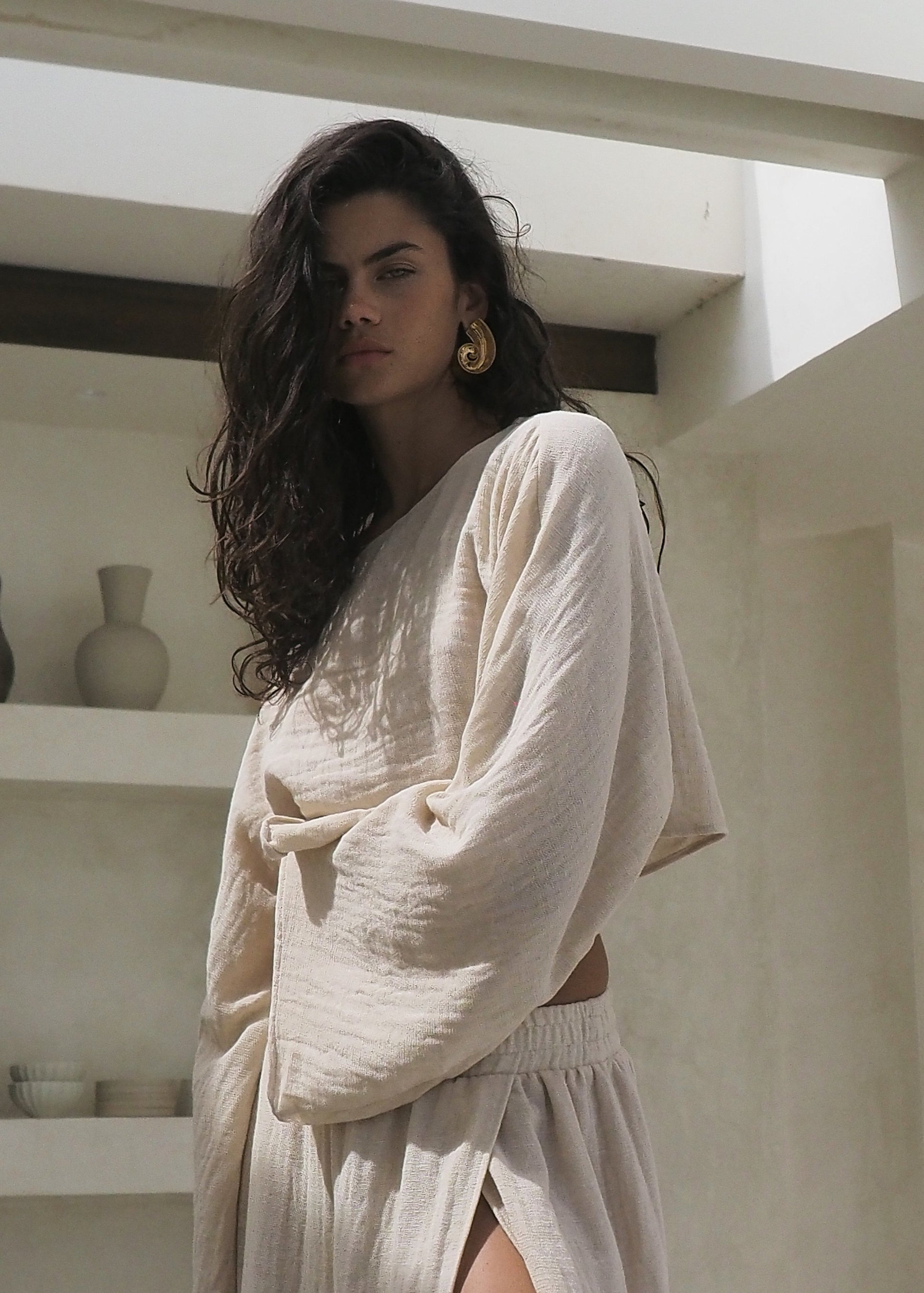 Muślinowa bluzka z długim rękawem z pewnością emanuje urokiem i subtelnością. Wykonana z delikatnego, przewiewnego materiału zapewnia komfort noszenia nawet w cieplejsze dni. Ta bluzka doskonale łączy w sobie elegancję i romantyzm. Wraz ze spodnią Sara stworzy look kompletny.