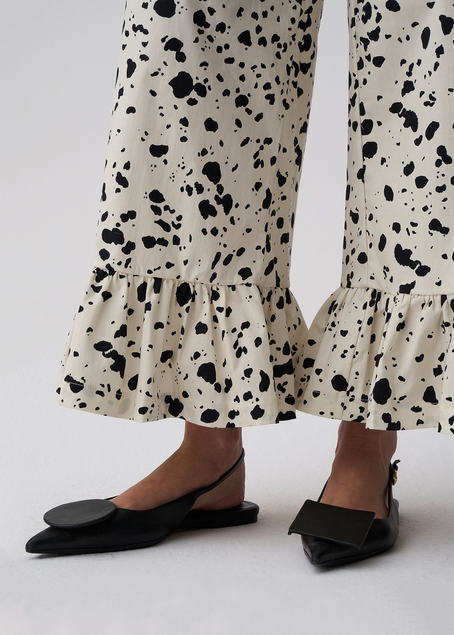 Luźne spodnie w czarno-biały wzór z motywem dalmatyńczyka to idealny wybór na letnie dni. Elastyczna talia i wykończenie nogawek falbaną zapewniają wygodę oraz kobiecy akcent. Połącz z jasnym topem lub swetrem Diana.