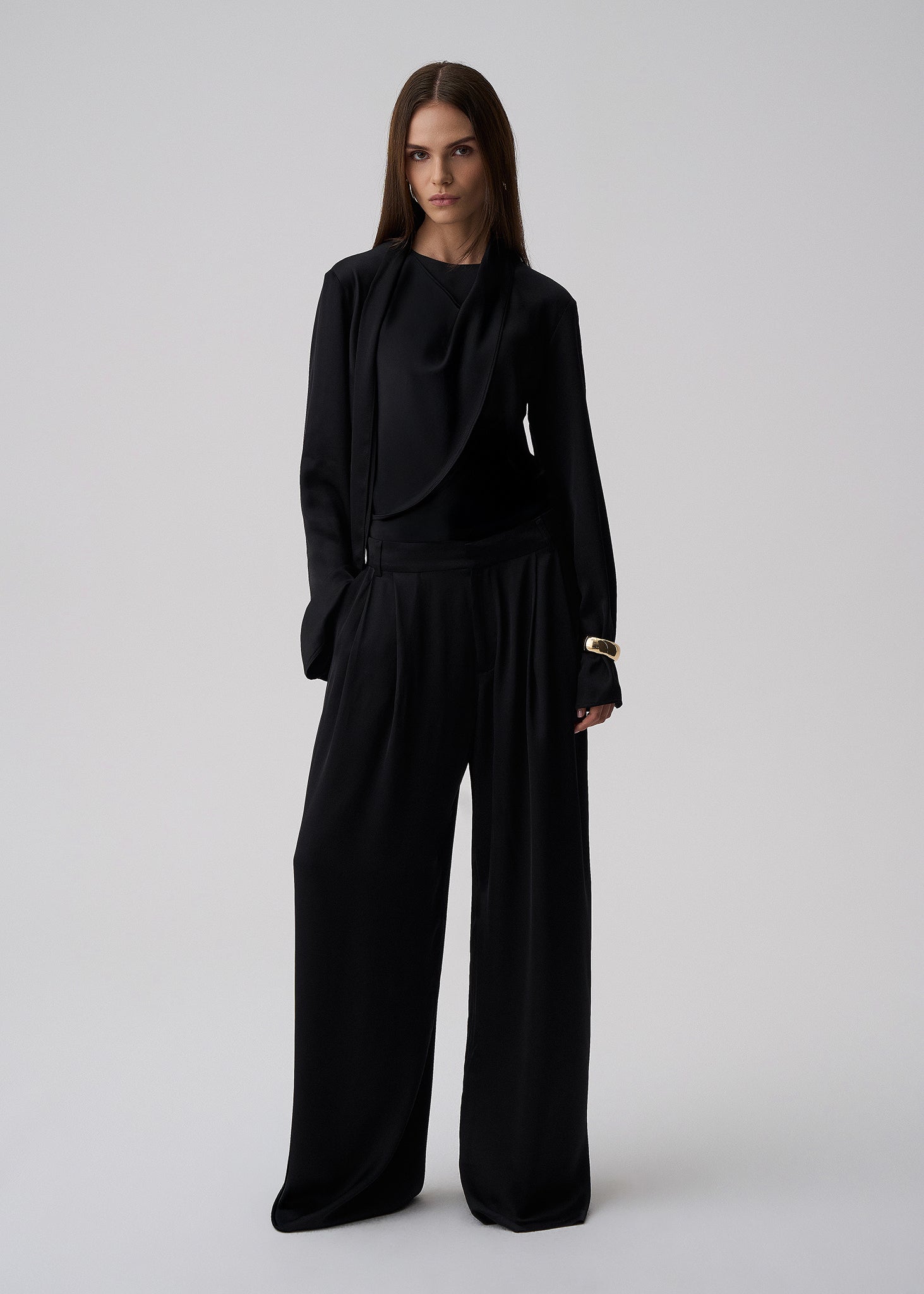 Eleganckie spodnie typu palazzo w kolorze czarnym i satynowanej tkaninie. Charakteryzują się niskim stanem oraz szerokimi, lejąco układającymi się nogawkami, które nadają sylwetce lekkości i optycznie ją wydłużają. Idealne do noszenia na dolnych biodrach.