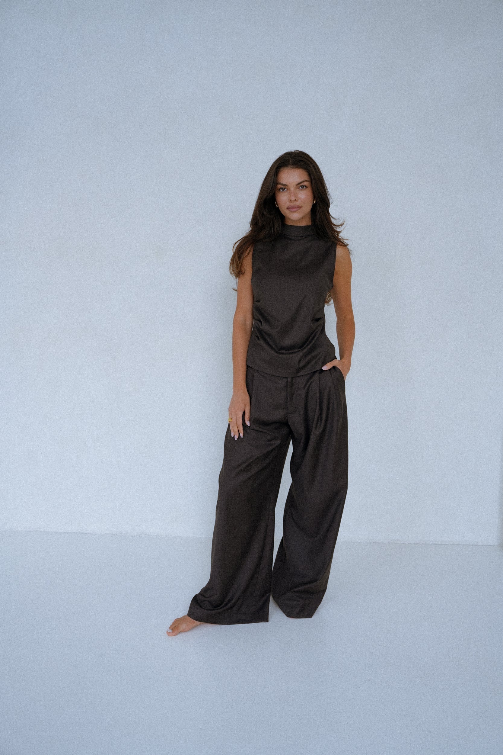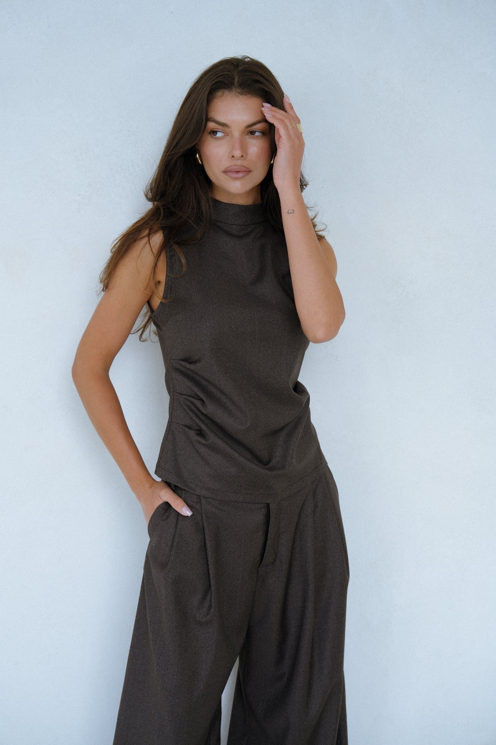 Elegancki top bez rękawów w odcieniu głębokiej szarości to współczesna odsłona klasyki. Smukły, dopasowany fason ze szlachetną stójką subtelnie podkreśla linię ramion i szyi, tworząc wyrafinowaną sylwetkę. Uszyty z miękkiej, gładkiej wełny o lekkiej elastyczności, zapewnia komfort noszenia i odporność na zagniecenia. Delikatne marszczenia w talii akcentują kobiece proporcje, a minimalistyczne zapięcie na suwak dodaje całości nowoczesnego charakteru. Doskonale prezentuje się w duecie z szerokimi spodniami, tworząc look pełen elegancji i swobody.
